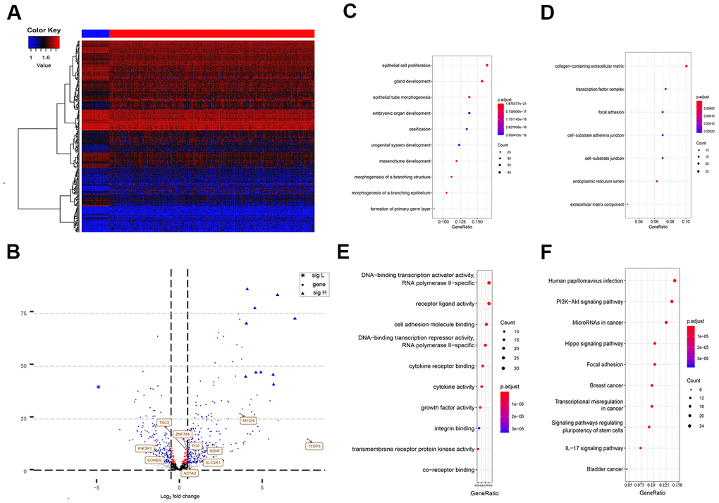 According to the functional enrichment analysis, the 270 EMT genes were mainly enriched in 634 GO terms and 68 KEGG pathways (P < 0.001). These results indicated that most of the EMT genes participated in biological processes. The top molecular functions of these 270 HCC-specific EMT genes included protein, RNA, and DNA binding, and enzyme activity, such as DNA-binding transcription activator activity, RNA polymerase II-specific co-receptor binding, and transmembrane receptor protein kinase activity (Figure 1E). In terms of biological processes, the majority of these genes were involved in epithelial cell proliferation (Figure 1C). These genes are the main cell component of the collagen-containing extracellular matrix (Figure 1D).