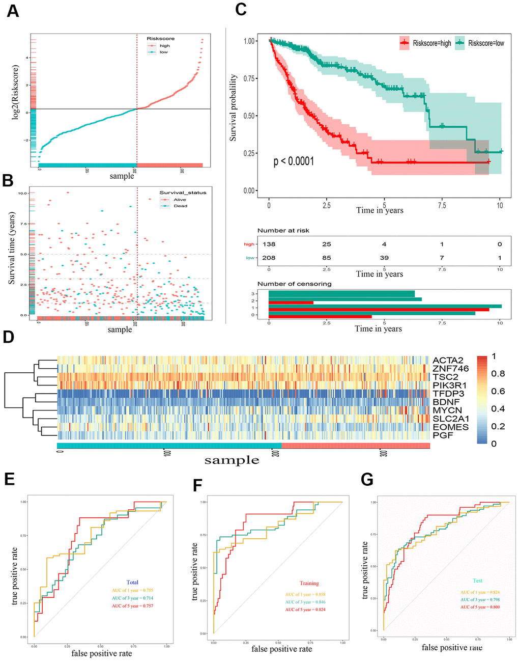 Through lasso Cox regression, we further narrowed the number of genes associated with OS to 22 (Supplementary Figure 1). Subsequently, an optimal prognostic signature based on ten EMT-related genes was identified by stepwise Cox analysis. The identified genes included tuberous sclerosis 2 (TSC2), actin alpha 2 (ACTA2), solute carrier family 2 member 1 (SLC2A1), placental growth factor (PGF), mycn proto-oncogene (MYCN), phosphoinositide-3-kinase regulatory subunit 1 (PIK3R1), eomesodermin (EOMES), brain-derived neurotrophic factor (BDNF), zinc finger protein 746 (ZNF746), and transcription factor Dp family member 3 (TFDP3). The expression of all ten risk genes in HCC was dysregulated (absolute logFC > 0.5, P < 0.0001), and only PIK3R1 and EOMES were downregulated. The relative gene expression levels of the ten prognostic genes after the sample ordered by risk score are shown in the heat map (Figure 2D). The patients were then stratified into low- and high-risk groups at the best separation cut-off of the risk score, and the risk score distribution of each patient is shown in Figure 2A. The survival of patients in the two groups was significantly different. The mean survival time of the high-risk patients was significantly shorter, and the vital status of death accounted for a larger proportion than that of low-risk patients (Figure 2B). Kaplan–Meier survival curve analysis revealed that the prognoses of patients in the high-risk group were significantly worse than those of patients in the low-risk group (Figure 2C). Kaplan–Meier survival curve analysis also showed that the expression of the ten genes, except BDNF, could distinguish the survival probability of patients with HCC (Supplementary Figure 2). A total of 346 patients were randomly divided into a training group (n = 200 cases) and a validation group (n = 146 cases). The AUCs for 1-, 3, and 5-year OS in the training group were 0.858, 0.846, and 0.824, respectively (Figure 2E). The AUCs for 1-, 3-, and 5-year OS in the validation group were 0.755, 0.714, and 0.757, respectively (Figure 2F). The AUCs for 1-, 3-, and 5-year OS in the overall sample were 0.824, 0.798, and 0.800, respectively (Figure 2G).