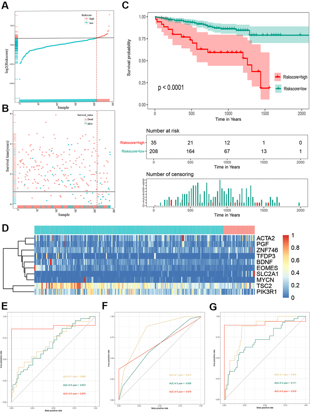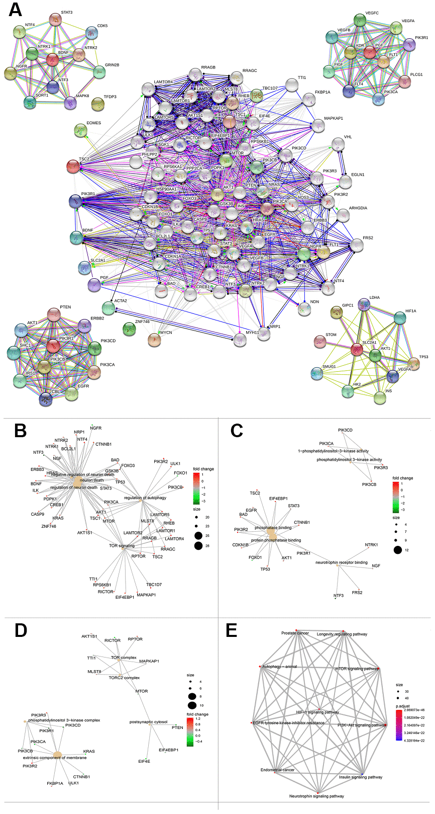 To further explore a well-documented protein-protein interaction (PPI) for the signature proteins, we established the protein-protein interaction network using the STRING database. The PPI network added another 70 proteins that had been verified to interact directly or indirectly with the ten genes identified in the current study. The PPI contained 80 nodes and 1,156 edges, and the PPI enrichment P value was < 1.0e-16. The top ten genes that interacted with PGF, SCL2AC1, PIK3R1, and BDNF are listed in the four corners of the PPI network (Figure 8A). The network also contains some tumor driver genes such as EGFR, VEGFA, NGFR, and AKT1. GO functional enrichment results showed that these genes were enriched in molecular functions including 1-PI3K activity and PI3K activity (Figure 8C). The extrinsic membrane component, TOR complex, PI3K complex, TORC2 complex, and postsynaptic cytosol were the top cell component functions enriched (Figure 8D). Additionally, TOR signaling, neuron death, regulation of neuron death, and regulation of autophagy were the top biological processes enriched (Figure 8B). The 3-gene concept network of GO analysis showed that most of the genes in PPI networks were upregulated. KEGG pathway analysis showed that the PPI network of the ten genes was mainly enriched in the PI3K/Akt signaling pathway, mTOR signaling pathway, autophagy-animal pathway, longevity regulating pathway, Epidermal growth factor receptor (EGFR) tyrosine kinase inhibitor resistance pathway, and hypoxia inducible factor (HIF)-1 signaling pathway (Figure 8E).