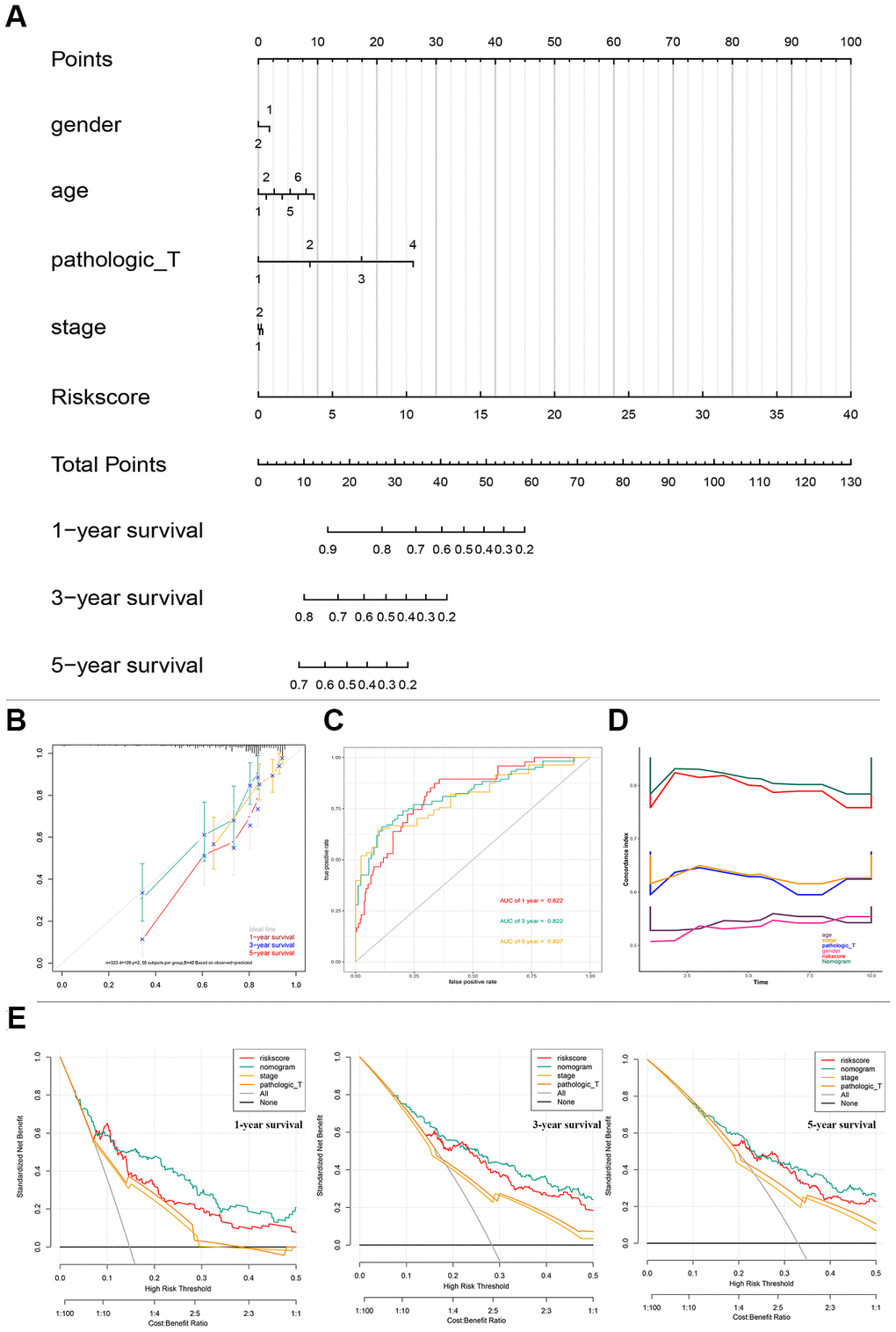 To better predict the prognosis of patients with HCC, a prognostic nomogram was constructed based on 323 HCC patients with complete clinical information about risk score combing clinical factors (age, sex, stage, pathologic T) (Figure 4A). The AUCs of 1-, 3-, and 5-year OS predictions were 0.822, 0.822, and 0.807, respectively (Figure 4C). The calibration plots showed that the nomogram was best for predicting 1-, 3-, and 5-year OS in patients with HCC (Figure 4B). The C-index values of the nomogram were 0.812, 0.799, and 0.633 respectively for 1-, 3-, and 5-year OS (P < 0.0001), suggesting that the performance of the nomogram was reliable (Figure 4D). DCA showed the nomogram performed better at the threshold probability (ranging from 2% to 50%) in Figure 4E. These results revealed that the prognostic nomogram was superior in predicting the 1-, 3-, and 5-year survival outcomes of patients with HCC.