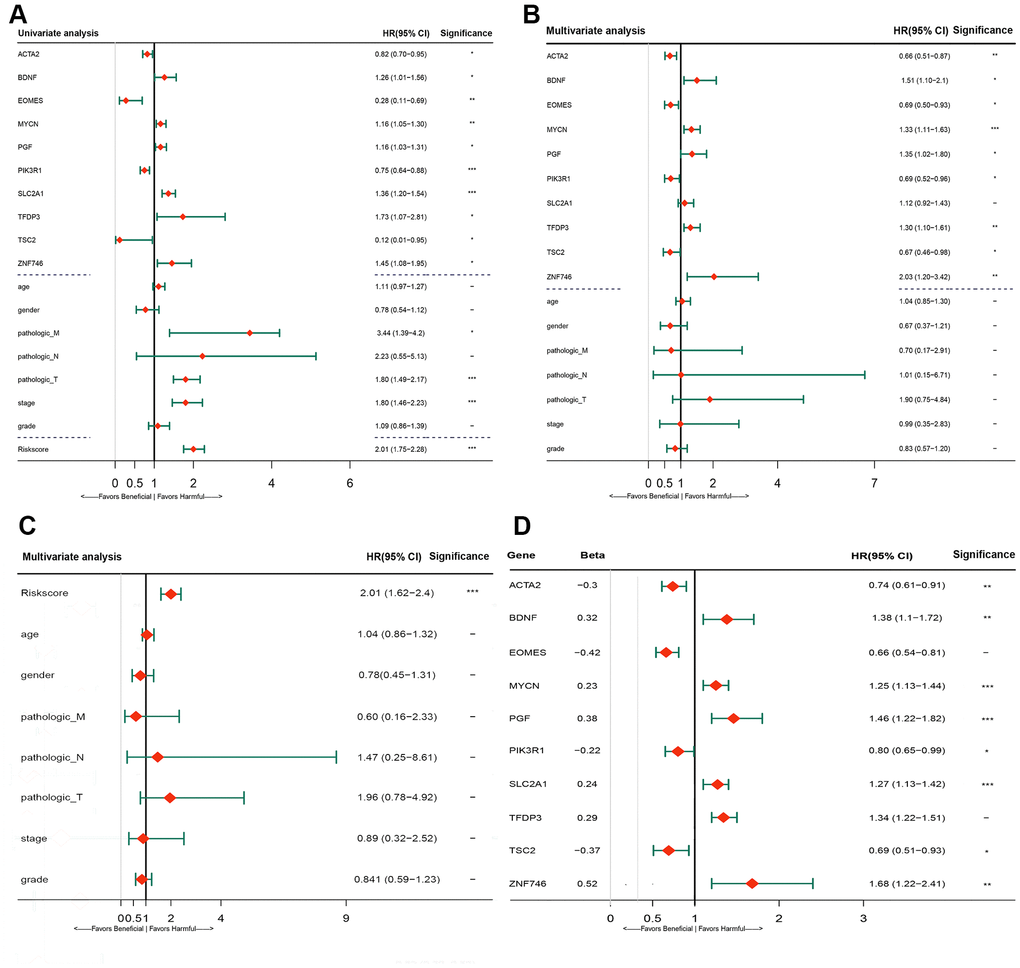 The risk score of each HCC sample and the corresponding clinical factors (including age, sex, tumor grade, tumor stage, and pathologic TNM staging) were subjected to univariate and multivariate Cox regression analyses. Univariate and multivariate Cox regression analysis were performed to investigate whether the prognostic gene signature or the individual genes could be independent prognostic indicators after combing the clinical parameters. P-values < 0.05 indicated statistical significance.