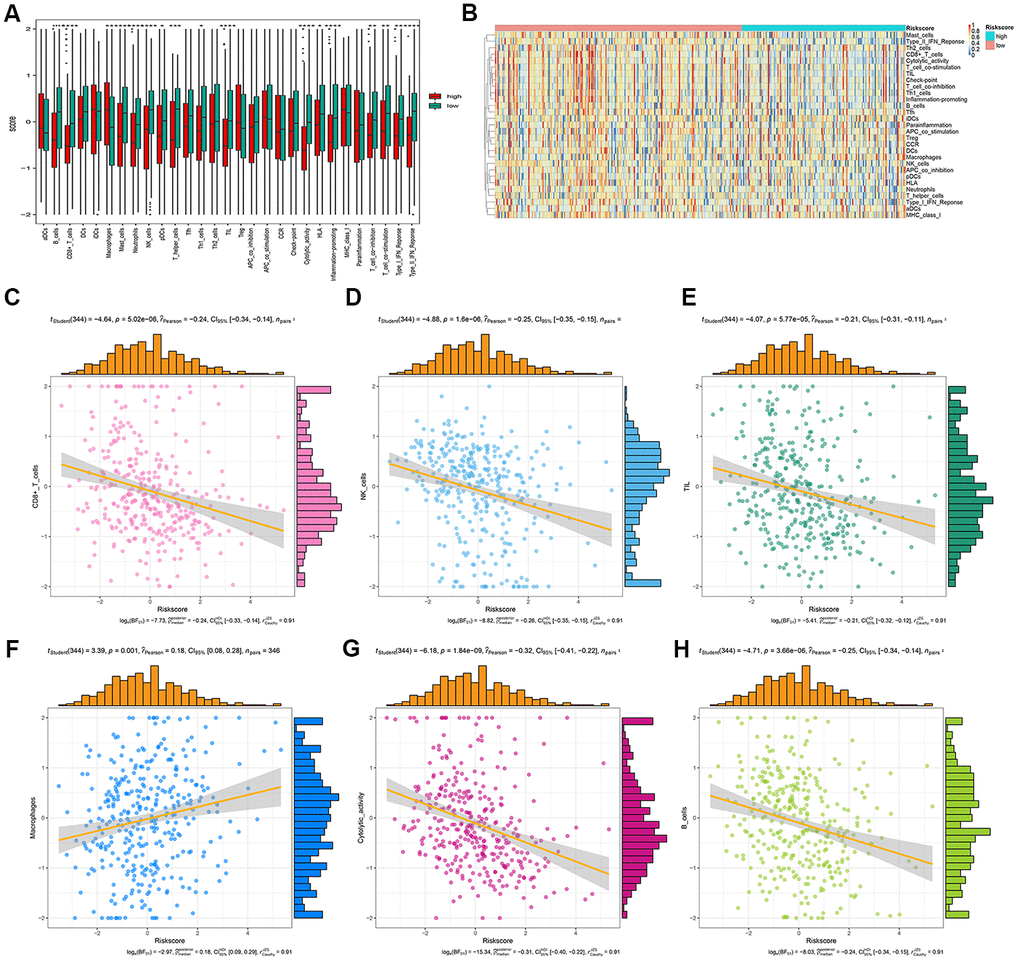 We analyzed the differences in tumor-infiltrating cells between the high- and low-risk groups. The amount of immune cell infiltration in low-risk patients was significantly higher than that in high-risk patients, and included cell types such as B cells, CD4+ T cells, macrophages, Th cells, and tumor-infiltrating lymphocytes (TILs). There were also significant differences in T-cell costimulation signaling and type I IFN signaling between the high- and low-risk groups (Figure 9A). Thus, the risk score can distinguish the type and distribution of immune cell infiltration because significant differences were found in the types of immune cell infiltration between patients with high- and low-risk scores (Figure 9B). The correlation analysis between the gene signature and different types of immune cell infiltration showed that the gene signature was negatively correlated with CD8+T cells, B cells, NK cells, TILs, and cytotoxic activity (P < 0.001), and positively correlated with macrophages (P = 0.001) (Figure 9C–9H).