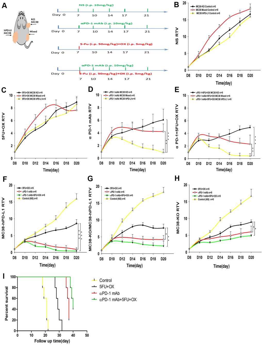 Then we compared the therapeutic effects of different treatment methods for the same type tumor. The tumor growth delay assay in Figure 1F–1H (Control group, yellow line; Chemotherapy group, black line; anti-PD-1 group, red line; Combined group, green line), for MC38-hPD-L1 tumor, tumor growth was inhibited in both combined treatment group and anti-PD-1 treated alone group, compared with the 5-FU+OX alone group (Figure 1F, Combined vs. Chemotherapy group, P<0.001; anti-PD-1 group vs. Chemotherapy, P<0.001). Similar results were found in both MC38 mixed group (Figure 1G, Combined vs. Chemotherapy group, P<0.01; anti-PD-1 group vs. Chemotherapy, P<0.05) and MC38-KO group (Figure 1H, anti-PD-1 alone vs. Chemotherapy, P<0.05; Combined vs. Chemotherapy group, P<0.05). The survival analysis showed in Figure 1I, it was observed that anti-PD-1 and combined groups had a better survival compared with chemotherapy and control groups. These results showed that, compared with anti-PD-1 alone, the combined therapy did not notably improve the antitumor effect in different tumors and PD1 blockade therapy was effective for MC38-KO groups.