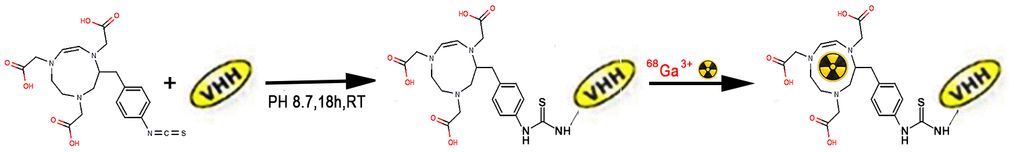 Add the conjugated complex (NOTA-Nb109) solution into the tube. And the reaction system pH was adjusted to 4.0 by adding 0.05 M HCl, following adding an aliquot of 68Ga 3+ (1 mL) in sodium acetate (225 μL of 0.25 M). After incubating for 10 min at 37° C, the antibody conjugate purifying was performed through PD-10 column. 68Ga-NOTA-Nb109 was eluted with saline, following with quality control for further study.