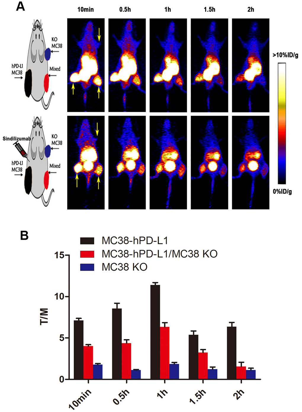 In conclusion, 68GaNOTA-Nb109, a newly developed 68Ga-labeled nanobody as a PET probe to assess the PD-L1 expression can monitor changes in PD-L1 expression. Additionally, the therapeutic potency of the new PD-1 targeting antibody, Sindilizumab, was evaluated in tumor-bearing mice and inhibited the PD-L1 positive tumor successfully, particularly the PD-L1 knockout tumor. The host immune system might be essential for PD-L1 and PD-1 blockade therapy, which may mechanistically explain for this potential therapeutic efficacy. Further studies are expected to clarify the precise mechanism and to promote the application of PD-L1 PET.
