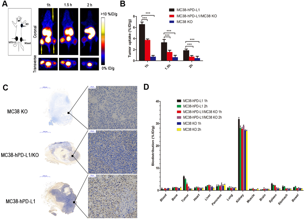 PET static scanning was performed on three types of tumor-bearing mice in Figure 4A. As expected, the MC38-hPD-L1 tumor was observed and showed the highest uptake of radioactivity at 1 h (6.56 ± 0.42 %ID/g) (Figure 4A, 4B). For the MC38-hPD-L1/MC38-KO tumor mixture, the content of uptake at 1 h was 3.74 ± 0.19 %ID/g, and it was almost half of that in MC38-hPD-L1 tumor at all time points. For PD-L1-negative MC38-KO tumor, it was not visible during the PET acquisition. The results correlated with PD-L1 expression as determined by IHC in Figure 4C.