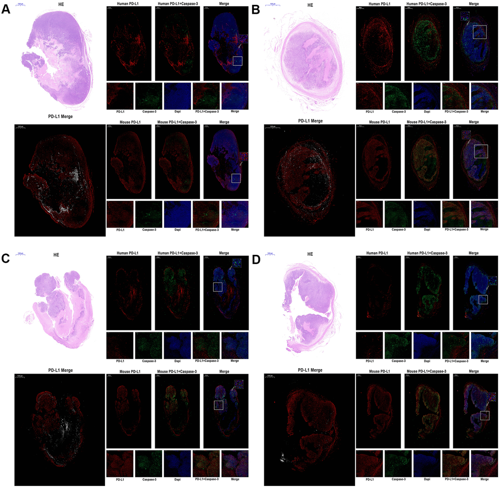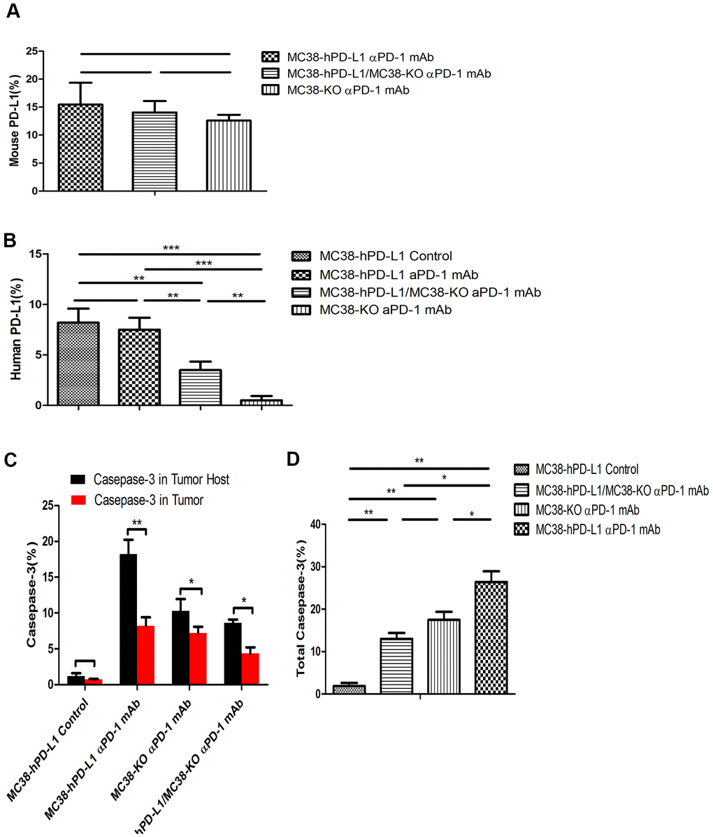 As the expression of PD-L1 determined the process of antigen extraction [17], we analyzed the caspase-3 induced by human PD-L1 and mouse PD-L1. In Figure 5A–5D, compared with the control groups, caspase-3 expressed widely and distributed in mPD-L1 expression area. The quantitative analysis were showed in Figure 6C, 6D. Caspase-3 in tumor-host was higher than that in tumor (for MC38 hPD-L1 group, P<0.01; for MC38 KO group, P<0.05; for MC38 Mixed group, P<0.05). The total Caspase-3 also had variant between different tumors, which were consistent with the results in vitro (MC38 hPD-L1 vs. Control group, P<0.01; MC38 hPD-L1 vs. MC38 KO group, P<0.05; MC38 hPD-L1 vs. MC38 Mixed group, P<0.05; MC38 Mixed vs. Control group, P<0.01; MC38 Mixed vs. MC38 KO group, P>0.05; MC38 KO vs. Control group, P<0.01). Together, these findings demonstrated that although MC38 KO tumor cell did not express hPD-L1 nor mPD-L1 per se, the host cell in the xenograft did expressed mPD-L1 after the MC38 KO xenograft was established. The growth of MC38 KO tumor was significantly retarded after given anti-PD-1 treatment as same as the MC38 hPD-L1 tumor and MC38 mixed tumor. We further verified that there was no significant difference in mPD-L1 expression among three types of MC38 tumor based on our RT-RCR data. While caspase-3 induced by PD-L1 had differences between different tumors. Therefore, we inferred that PD-L1 on tumor cells could affects the efficacy to checkpoint blockade, but PD-L1 in host cells might be essential for this response.