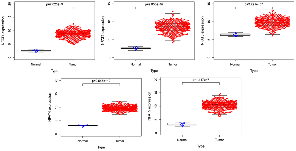To analyze gene expression profiles for the NFAT family of gene products in different malignant cancer, the GTEx, TCGA, and Oncomine databases were used. Oncomine is an online cancer microarray database (http://www.oncomine.org) [14] with a gene chip-based database and integrated data extraction platform. In this study, Oncomine was selected to compare the gene expression of NFAT family in tumors vs. normal tissues. The selection criteria for this study were “P<0.05, threshold: 2-fold change, gene rank: top 10%.” Meanwhile, the Gene Expression Profiling Interactive Analysis (GEPIA) tool was used to analyze the clinical datasets in the GTEx and TCGA databases to compare NFAT gene expression differences in pan-cancer models (http://gepia.cancer-pku.cn) [15].