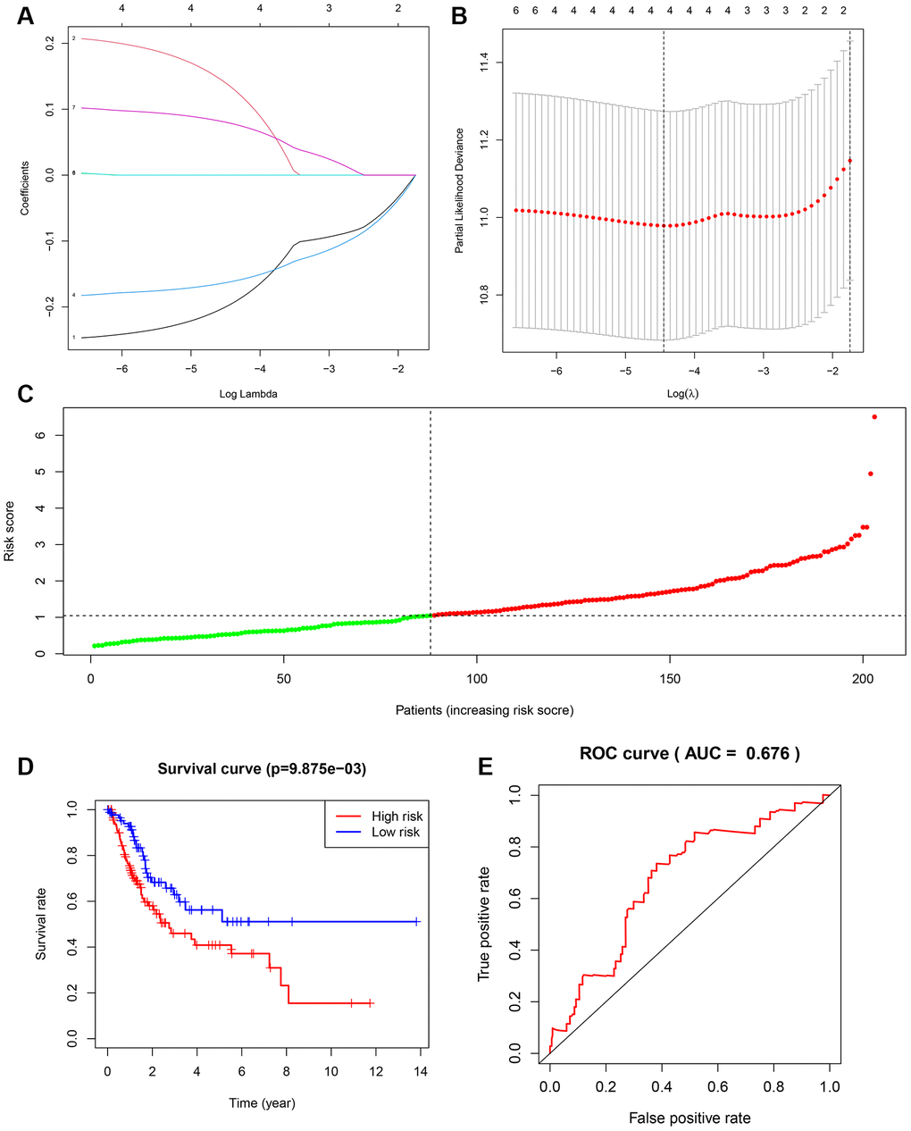 The samples were randomly divided into training set and testing set, and the training set was used to obtain the model. The predictive model was characterized by the linear combination of the expression of these 5 genes weighted by their relative coefficient in the multivariate Cox regression as follows: risk score = (-0.262991181 * expression of FER1L4) + (0.235961475 * expression of RNF128) + (-0.180646092 * expression of EPHB6) + (0.097234847 * expression of FN1) + (0.084658888 * expression of NFAT2).