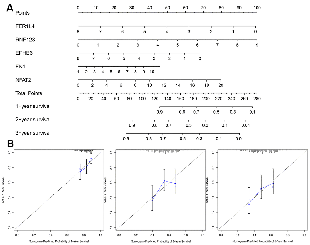 To establish a clinically applicable method for predicting the BLCA patients’ survival probability, a nomogram was built to predict the probability of the 1-3-5 years OS in the testing set (Figure 11A). The predictors of the nomogram included 5 factors. The 45° line represented the best prediction. Calibration plots showed that the nomogram performed well (Figure 11B).