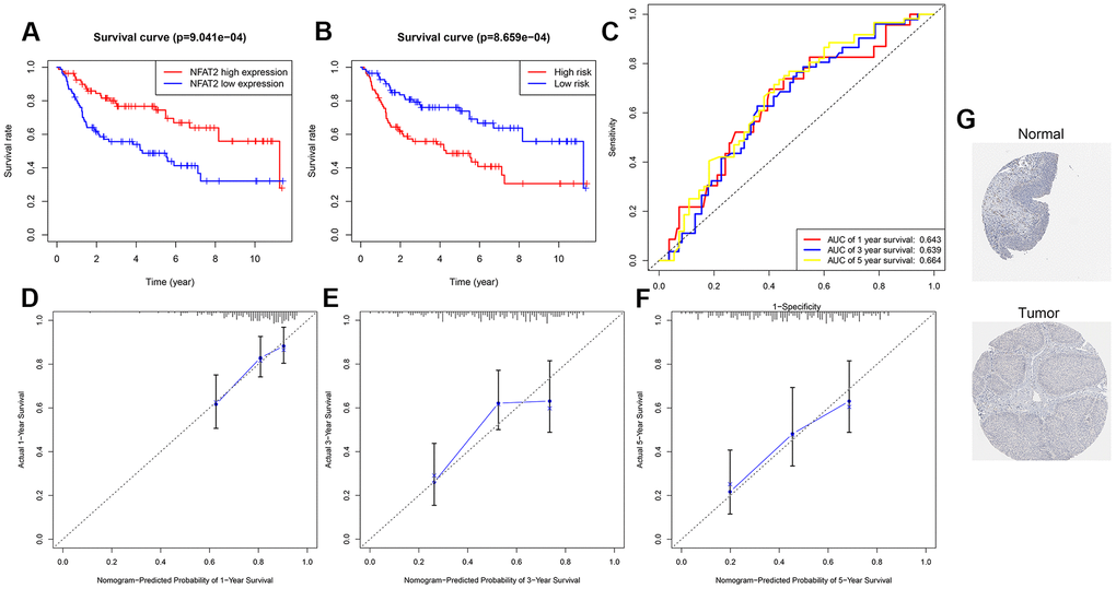 To verify the prognostic value of NFAT2 and accuracy of the model for BLCA patients, we further analyzed other BLCA clinical expression datasets. Microarray data from clinical study GSE100926 in the GEO database was extracted and found significant differences in expression between BLCA cancer tissues and adjacent tissues. Representative images of the NFAT2 protein levels were shown the same expression trend in the HPA database. Normal bladder tissue staining of NFAT2 showed median expression in the nucleus (Figure 12G). However, in the cancer tissue samples, the NFAT2 nuclear staining was significantly weaker than in normal tissue. According to the median value of NFAT2 nuclear expression as a classified condition, it was found that the survival condition of the low-expression group of NFAT2 was better than that of the high-expression group, which indicated that the nuclear levels of NFAT2 could affect the survival of BLCA patients (Figure 12A). Meanwhile, the prognostic model was assessed in the GEO data. A total of 165 patients in the GSE100926 data were classified into a low-risk group and a high-risk group using the risk score mode. The result was consistent with the result in TCGA. The OS of the BLCA patients in the GSE100926 data in the high-risk group was significantly lower than that in the low-risk group (P<0.05) (Figure 12B). Furthermore, the AUCs of the external verification set were 0.643 at 1 year, 0.639 at 2 years, and 0.664 at 3 years, demonstrating that this risk model can predict the OS of BLCA patients (Figure 12C). The survival of patients was calculated based on the nomogram, and find that the nomogram performed well (Figure 12D, 12E). In order to further verify the accuracy of our model, using the same method with GSE48276 in the GEO database, the results also show that the model has a higher accuracy. The AUCs of GSE48276 was 0.643 at 1 year, 0.619 at 2 years, and 0.622 at 3 years.