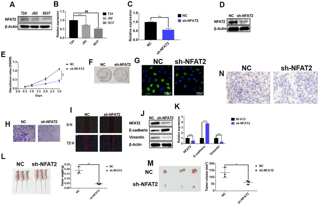 In our previous studies it was found that in BLCA patients, the overall survival of the low expression group of NFAT2 was higher than that of the high expression group. We speculated that NFAT2 may function as an oncogene within the context of BLCA disease. We carried out cellular studies on three different BLCA cell lines, T24, J82, and 5637 (Figure 13). NFAT2 was expressed ~2-fold more in T24 vs. 5637 BLCA cell lines (Figure 13A, 13B). In the 5367 cell line, knockdown of NFAT2 expression using small hairpin RNA (sh-NFAT2) using stable lentiviral transduction caused ~80% reduction in NFAT2 levels (Figure 13C, 13D). NFAT2 knockdown caused ~60% reduction in 5637 cell proliferation (Figure 13E). The colony formation assay showed that knockdown of NFAT2 also caused a significant ~2-fold reduction in formation of the 5637 cell colonies (Figure 13F). Incorporation of EdU nucleotide analog into genomic DNA to assess new DNA synthesis revealed similar findings on 5637 cell proliferation (Figure 13G). Simultaneously, the Transwell cell migration assay showed revealed that NFAT2 knockdown inhibits the migratory and invasive capacity of 5637 cells (Figure 13H). The wounded cell monolayer assay experiment also showed that NFAT2 knockdown caused ~2-fold decrease in cell migration (Figure 13I). Further analysis of control and NFAT2 knockdown 5637 cells using immunoblotting showed a significant increase in E-cadherin and decrease in vimentin levels (Figure 13J). Quantification using qRT-PCR in these 5637 cells revealed ~2-fold decrease in NFAT2 mRNA correlated with ~4-fold increase in E-cadherin and ~4-fold decrease in vimentin mRNA levels (Figure 13K). Such findings link NFAT2 regulation of differential gene expression for E-cadherin and vimentin in BLCA development and progression.