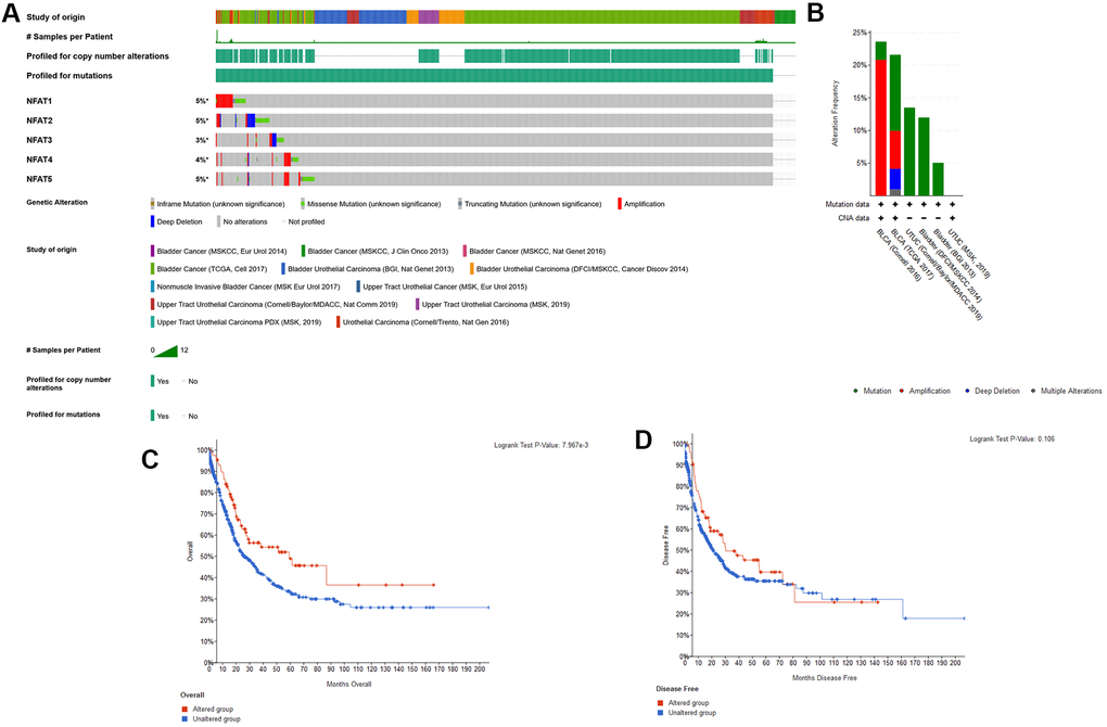 The expression of the mRNA expression levels corresponding to NFAT family members in BLCA patients was analyzed using the GTEx and TCGA database. The results showed that the NFAT family gene expression increased in the BLCA (Figure 1). To further determine the genetic alterations linked to such effects we used the cBioPortal database. Amongst the 12 clinical datasets which were analyzed, the frequency of gene alterations, including mutations, amplifications, deep deletions, and multiple alterations, ranged from 0.97% to 20.83%, with mutations and amplifications being the most observed alterations (Figure 2A). The % of genetic alterations within the NFAT family in BLCA varied from 3% to 5% for individual NFAT gene loci (Figure 2B). Meanwhile, clinical survival information was extracted to analyze the prognostic roles of the NFAT family in BLCA patients with or without alterations (Figure 2C). The results showed that the altered group had improved OS, but did not observe any significant correlation between the presence of alterations and DFS (Figure 2D).