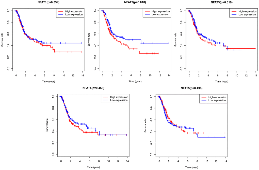 To further explore the prognostic value of each NFAT gene in BLCA, we used R software with a survival package to analyze the clinical BLCA datasets in the TCGA database. The results showed that after grouping BLCA patient overall survival (OS) based on the median value of gene expression, low NFAT2 expression was strongly associated with the better or improved OS, whereas NFAT1, NFAT3, NFAT4, and NFAT5 expression were not related to OS in BLCA patients (Figure 3).