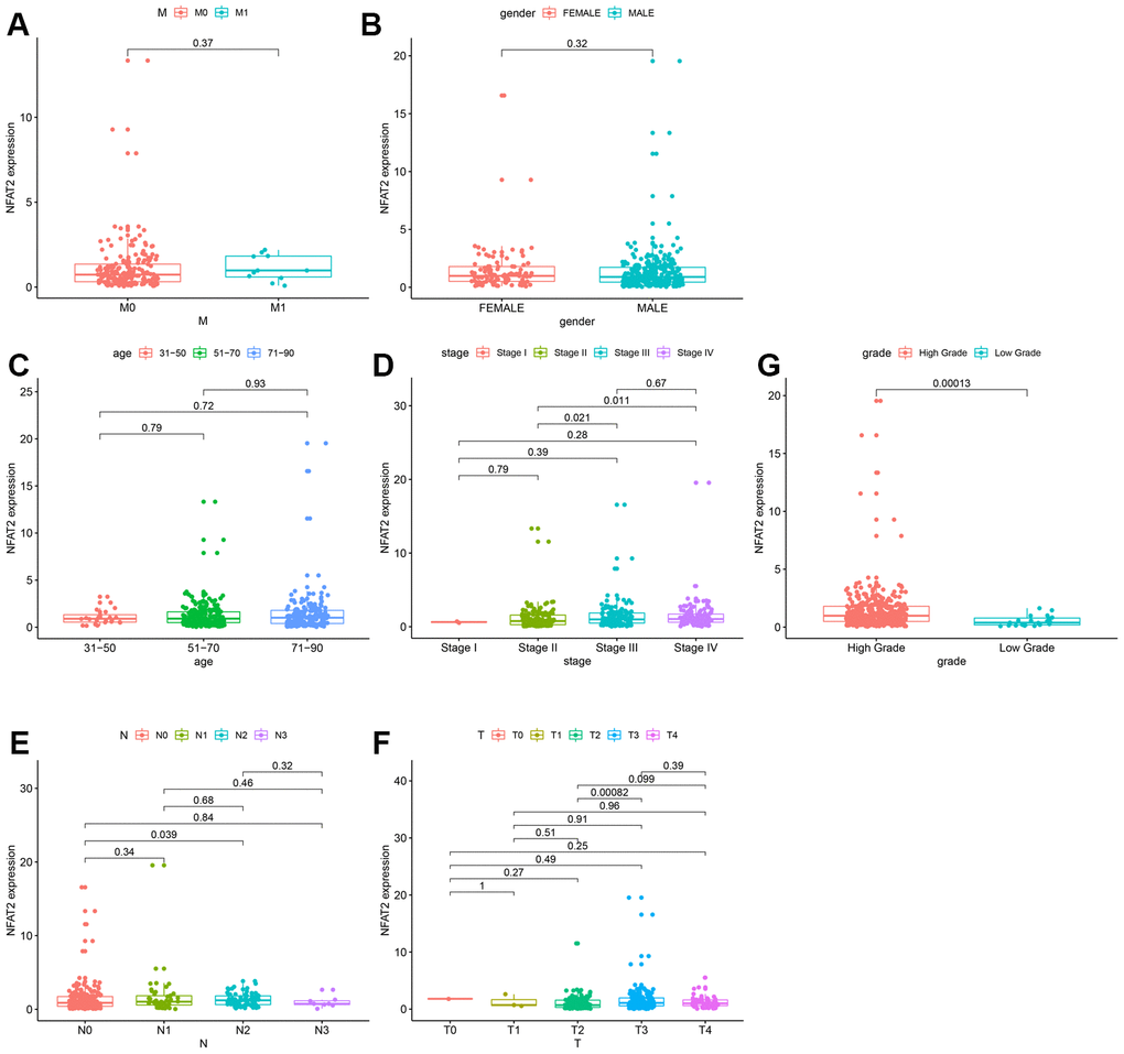 Analysis of the clinical data extracted from TCGA found that the expression of NFAT2 had no relevance to the M stage, stage, gender, and age of the tumor (Figure 4A–4D). For N stage, only N0 and N2 had a significant difference, but there was no continuous significance from N0 to N4. It indicated that NFAT2 and N stage were not closely connected (Figure 4E). The same result also appeared in the T stage (Figure 4F). Surprisingly, in the classification of the BLCA tumor grades, NFAT2 expression in high-grade groups was significantly higher than in low-grade groups (Figure 4G).
