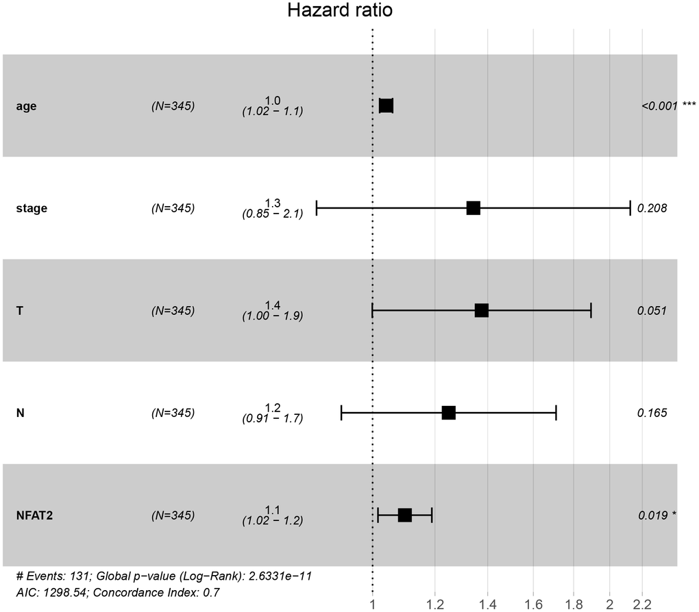 The information of BLCA patients with incomplete follow-up was removed from subsequent analyses. A Cox regression model for univariate analysis was used: we found that NFAT2 had no significant correlation with BLCA tumor stage and grade (Table 1). Moreover, the hazard ratio (HR) value was 1.113. In the TCGA database, the level characteristics of BLCA were only divided into high-grade and low-grade tumors. However, no deaths were recorded in BLCA patients with low-grade tumors. Surprisingly, multi-factor analysis using the Cox model found that NFAT2 could be used as an independent prognostic risk factor and was not affected by other factors (Figure 5).