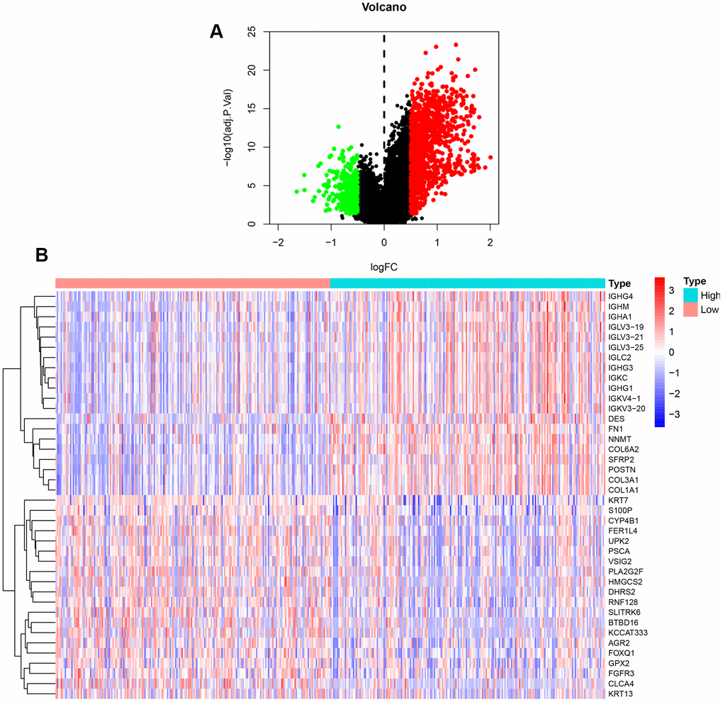 The clinical data were extracted from the TCGA database and divided into high expression and low mRNA expression groups according to NFAT2 median expression. R software with limma, pheatmap, and ggplot2 packages was used to determine differential genes between the two groups. The 20 DEGs with the most significant up-regulation and down-regulation were displayed using volcanic and heat maps. Differential gene screening criteria | log FC | ≥2, P<0.05.