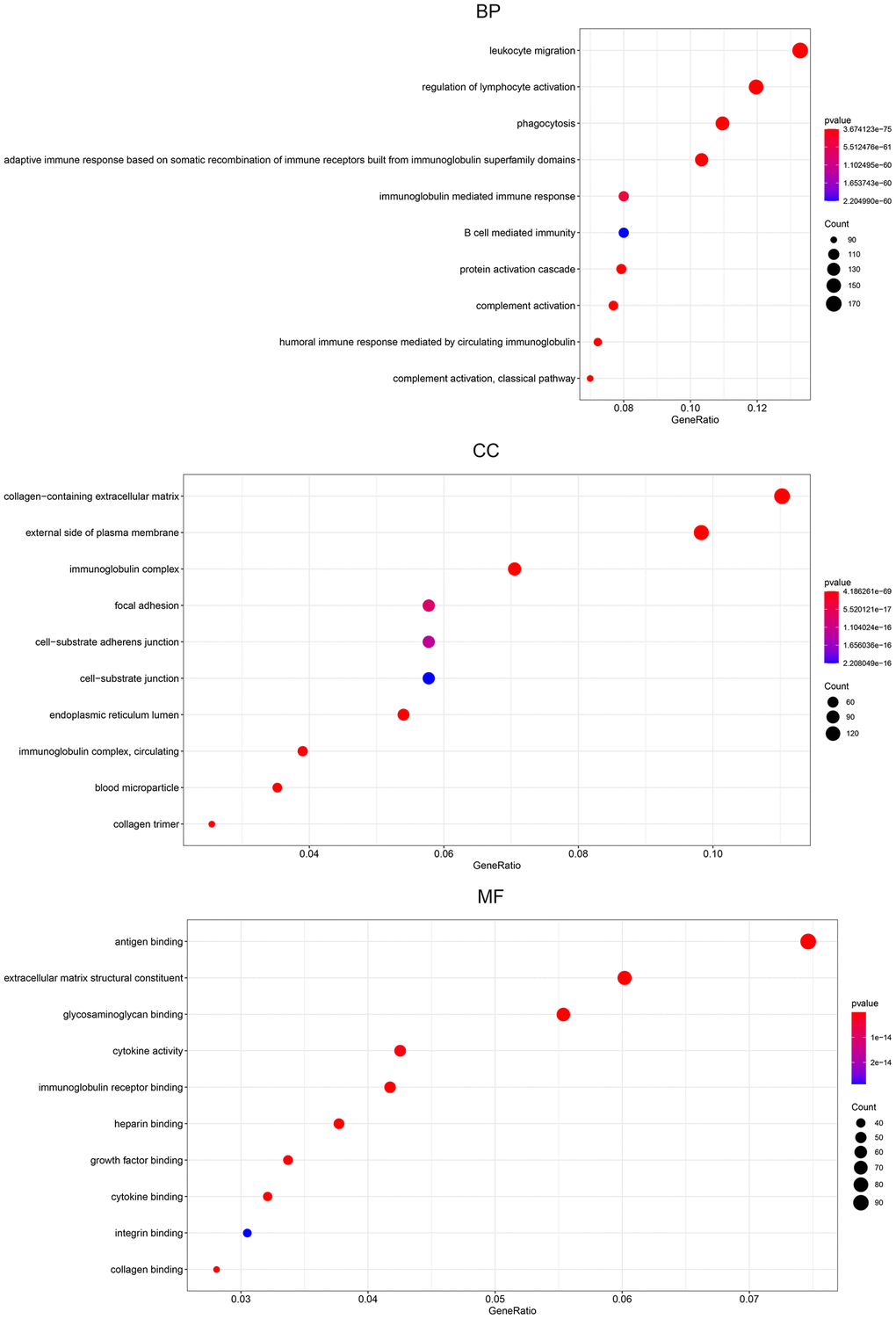 To assess DEG functionality, R software with the limma package was used to analyze all DEGs identified in BLCA. Our results showed that 2198 GO terms were enriched. The enrichment items were classified into 3 functional groups: biological process (BP) group (1888 items), cellular component (CC) group (137 items), and molecular function (MF) group (173 items). The top 10 significant biological processes GO terms are shown for each item (Figure 7). Within the BP group, the top 3 significant biological processes were leukocyte migration, regulation of lymphocyte activation, and phagocytosis. In the CC group, highlighted gene products were associated with the collagen-containing extracellular matrix, extracellular side of the plasma membrane, and immunoglobulins. Finally, the most enriched GO terms in the MF group are antigen binding, extracellular matrix structural constituent, and glycosaminoglycan binding.