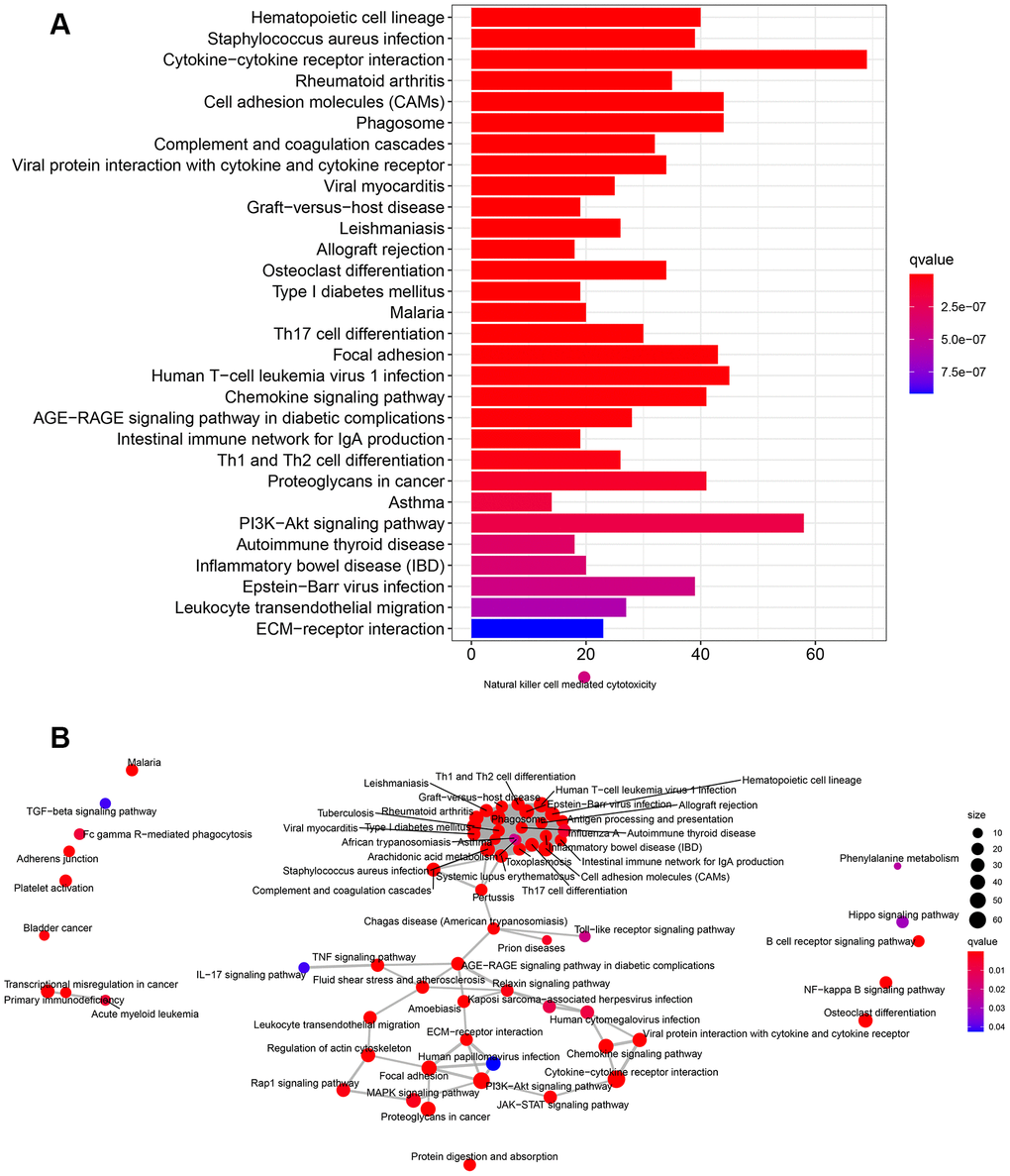 KEGG pathways were mainly enriched in cytokine-cytokine receptor interaction, human T-cell leukemia virus 1 infection, MAPK signaling pathway, PI3K-Akt signaling pathway, and chemokine signaling pathway (Figure 8A). The pathway-pathway network showed the relationship between the 67 KEGG pathways enriched in all DEGs (Figure 8B).