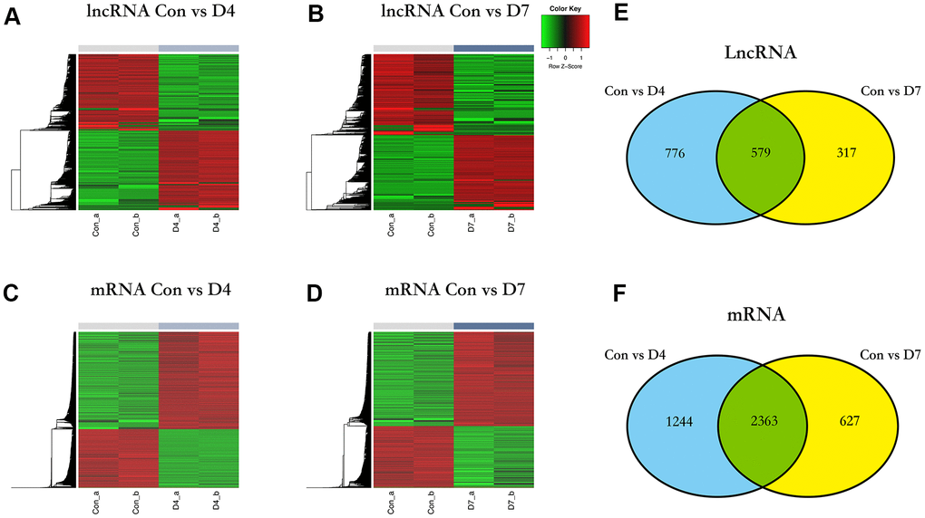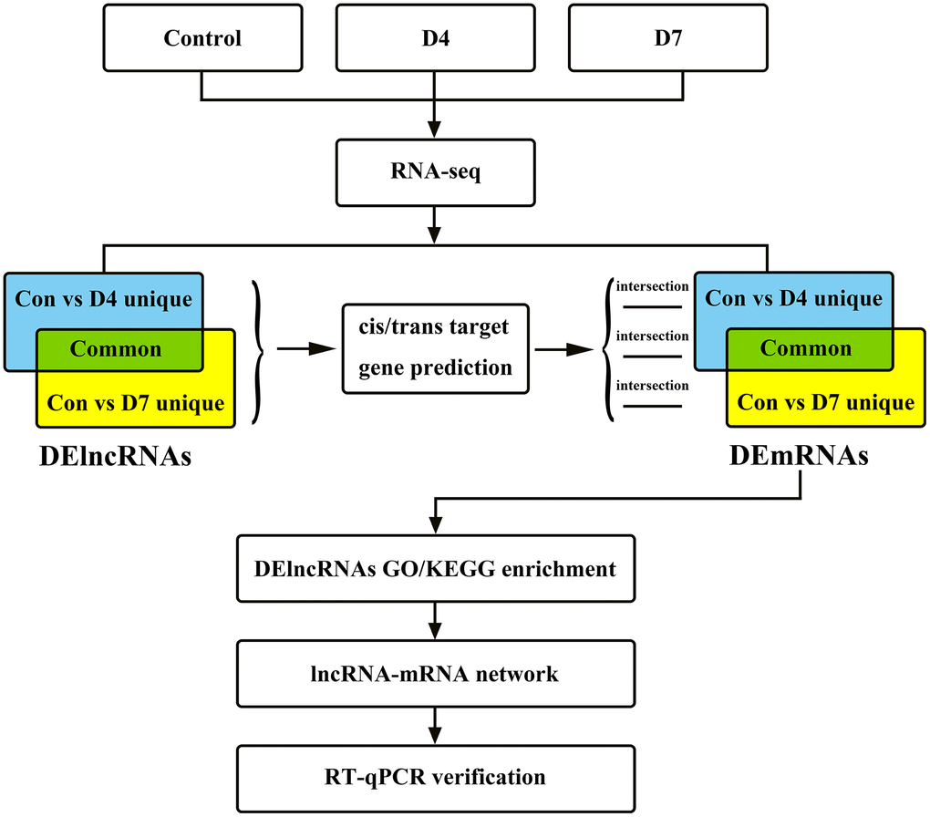 With the use of Stringtie software, the fragment numbers of each gene were counted, which were then normalized by TMM (trimmed mean of M values) method. Finally the FPKM value of each known or newly predicted lncRNAs was calculated using perl script, where the lncRNA ID starting with NON is the known lncRNA in the NONCODE database, the ID starting with ENS is the known lncRNA in the Ensembl database, and the ID starting with MSTRG is the newly predicted lncRNA. The edgeR package [20] was then used to analyze the differentially expressed genes between samples (Control vs D4 and Control vs D7). The screening criteria for differentially expressed genes were as follows: (1) q-value (the corrected p-value) < 0.05, and (2) the absolute value of fold change ≥ 2. The RNA-seq data were released to the National Center for Biotechnology Information (NCBI) Gene Expression Omnibus (GEO) database under the accession number GSE162548.
