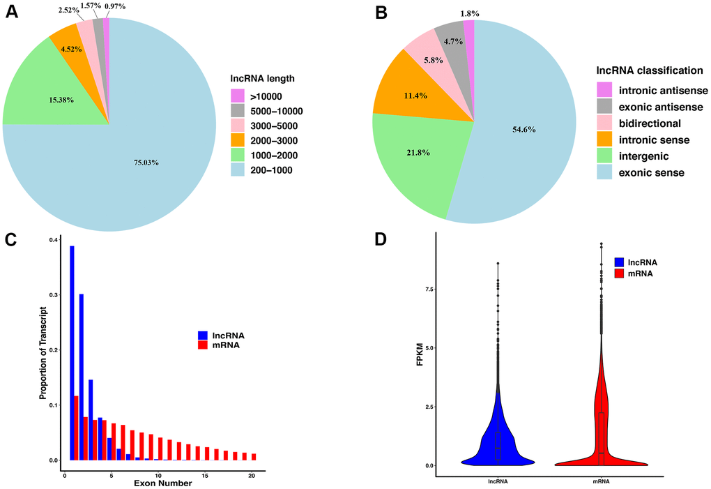 The lncRNAs identified by sequencing were classified and counted according to their lengths (Figure 2A). As the length of lncRNAs increases, its proportion to the total lncRNA number decreases. LncRNAs with a length of 200 - 1,000 nt accounted for the highest proportion, up to 75.03%, and lncRNAs with a length greater than 10,000 nt accounted for the lowest proportion, only 0.97%. Furthermore, lncRNAs were classified according to their location in the genome (Figure 2B), and the results showed that the lncRNAs originating from the exon region of the coding sequences (exonic sense) accounted for the highest proportion (54.6%), followed by the intergenic lncRNAs (21.8%). The lncRNAs originating from the intron region of the antisense strand (intronic antisense) accounted for the lowest proportion (1.8%). The lncRNAs and mRNAs were then statistically analyzed according to the exon numbers (Figure 2C), and the results showed that lncRNAs containing only one exon accounted for the largest proportion (38.86%), and the proportion of lncRNAs containing 1 to 4 exon numbers to the total number of lncRNAs was over 91%. Such results were consistent with the lncRNA length proportion: the proportion of lncRNAs less than 2,000 nt was 90.41%. Finally, the average expression value of lncRNAs and mRNAs was analyzed (Figure 2D): The average expression level of lncRNAs is slightly higher than that of mRNAs, and the expression value distribution is more concentrated.