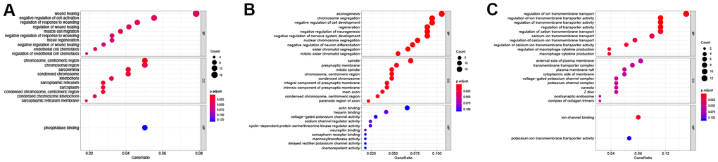 The results of GO enrichment analysis showed that in BP the DElncRNAs unique to the control vs D4 were mainly enriched in wound healing, regulation of response to wound and endothelial cell chemotaxis and other GO terms related to wound healing; in CC, these lncRNAs were mainly enriched in cellular regions related to chromatin, centriole and sarcoplasmic reticulum; and they were only enriched in a single GO term, phosphatase binding, in MF (Figure 4A and Table 2). The common DElncRNAs shared by control vs D4 and control vs D7 groups were mainly enriched in axongenesis, chromosome segregation and regeneration and other biological processes related to axon regeneration and cell cycle; in CC, they were mainly enriched in spindle, presynaptic membrane and main axon and other regions; in MF, they were enriched in actin binding, heparin binding and sodium and potassium ion channel activity (Figure 4B and Table 3). The DElncRNAs unique to the control vs D7 group were mainly enriched in ion transmembrane transporter channel activity in BP; these lncRNAs were mainly enriched in transmembrane transport complex and ion channel complex in CC; and they were mainly enriched in ion channel binding and potassium ion transmembrane transporter activity in MF (Figure 4C and Table 4).