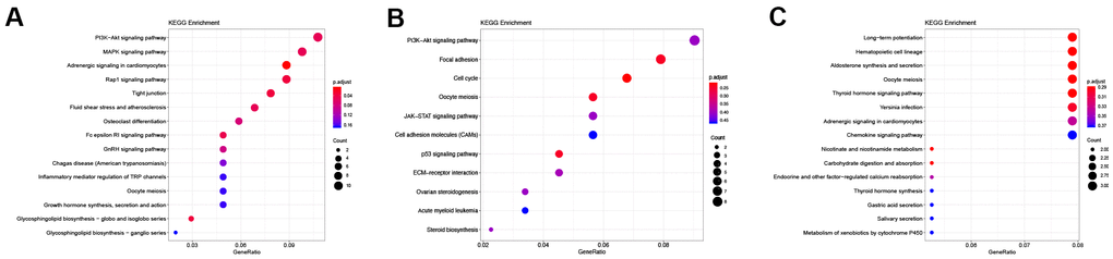 KEGG pathway enrichment results (Table 5) showed that the DElncRNAs unique to the control vs D4 group were mainly enriched in the PI3K-Akt signaling pathway, MAPK signaling pathway and Rap1 signaling pathway (Figure 5A). The common DElncRNAs of these two groups were mainly enriched in the PI3K-Akt signaling pathway, focal adhesion and the cell cycle (Figure 5B). Interestingly, the control vs D4 group unique DElncRNAs and common DElncRNAs were both enriched in the PI3K-Akt signaling pathway. However, the specific DElncRNAs were totally different in these two groups: the control vs D4 unique DElncRNAs that were enriched in the PI3K-Akt signaling pathway included Col4a5, Fgf1, Ghr, Magi2, Met, Pdgfa, Ppp2r2b, Ppp2r2c, Prkaa2, Prlr and Thbs2, while the common DElncRNAs enriched in this pathway included Ccne1, Cdkn1a, Col9a1, Erbb4, Fgf7, Itgb8, Lamc2 and Tnr. The DElncRNAs unique to the control vs D7 group were mainly enriched in the long-term potentiation, hematopoietic cell lineage and aldosterone synthesis and secretion pathways (Figure 5C).