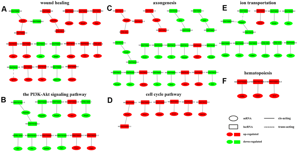 The GO terms and KEGG pathways with high enrichment scores and strong correlations with nerve regeneration were selected, and lncRNA-mRNA interaction networks were constructed within each group, with the regulation trend and the interaction mechanism annotated. The lncRNA-mRNA interaction networks of wound healing and the PI3K-Akt pathway, highly enriched GO term and KEGG pathway of the control vs D4 group unique DElncRNAs are displayed in Figure 6A, 6B, respectively. The networks of axongenesis and cell cycle pathways, highly enriched GO term and KEGG pathway of common DElncRNAs are displayed in Figure 6C, 6D, respectively. The networks of ion transportation and hematopoiesis, highly enriched GO term and KEGG pathway of the control vs D7 group unique DElncRNAs are displayed in Figure 6E, 6F, respectively. From the interaction networks, we found the following rules: (1) most lncRNAs are consistent with their corresponding mRNA regulation trends, and the expression trends of only a few pairs of lncRNAs and mRNAs are opposite, including NONRATT028679.2-Smad3, NONRATT028680.2-Smad3, NONRATT015315.2-Igsf10 and NONRATT030680.2-Col4a5; (2) the action mode of most lncRNAs on mRNAs is cis-acting, except NONRATT015315.2-Igsf10 and NONRATT026281.2-Rapgef3, whose mode of action is trans-acting; (3) the regulatory relationship between most lncRNAs and mRNAs is one-to-one, only a few mRNAs are regulated by two lncRNAs, and very few mRNAs are regulated by three lncRNAs at the same time.
