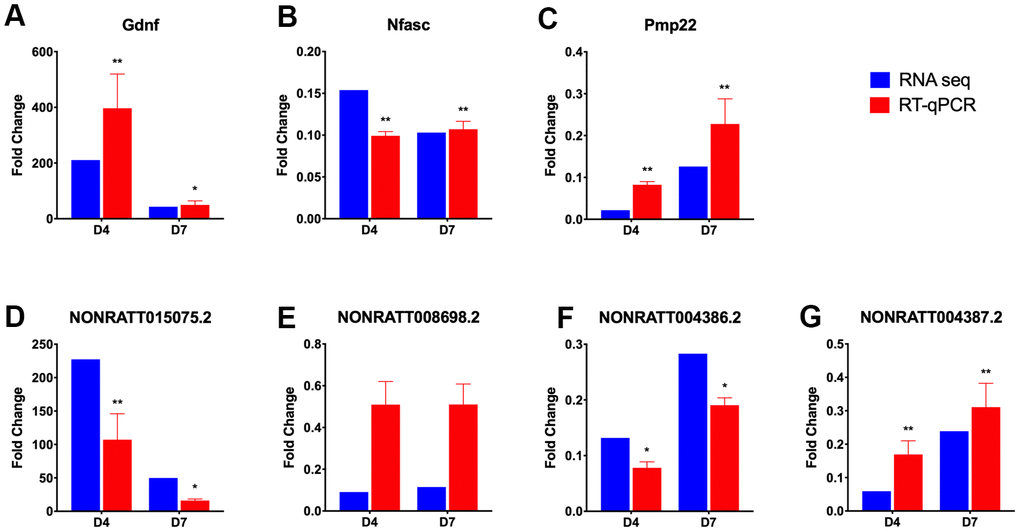 Three sets of lncRNA-mRNA interaction pairs enriched in GO term axongenesis (Figure 6C), including 3 mRNAs and 4 lncRNAs, namely, Gndf and NONRATT015075.2, Nfasc and NONRATT008698.2, Pmp22 and NONRATT004387.2, NONRATT004386.2 were selected, and their expression was measured using RT-qPCR to verify the accuracy of the RNA-seq sequencing results. The RT-qPCR results (Figure 7) showed that the expression trends of the above 7 genes on D4 and D7 post-operation compared to the control group were completely consistent with the RNA-seq results. In addition to the NONRATT008698.2 gene, the expression levels of the other 6 genes on D4 and D7 all had significant differences compared to the control group.