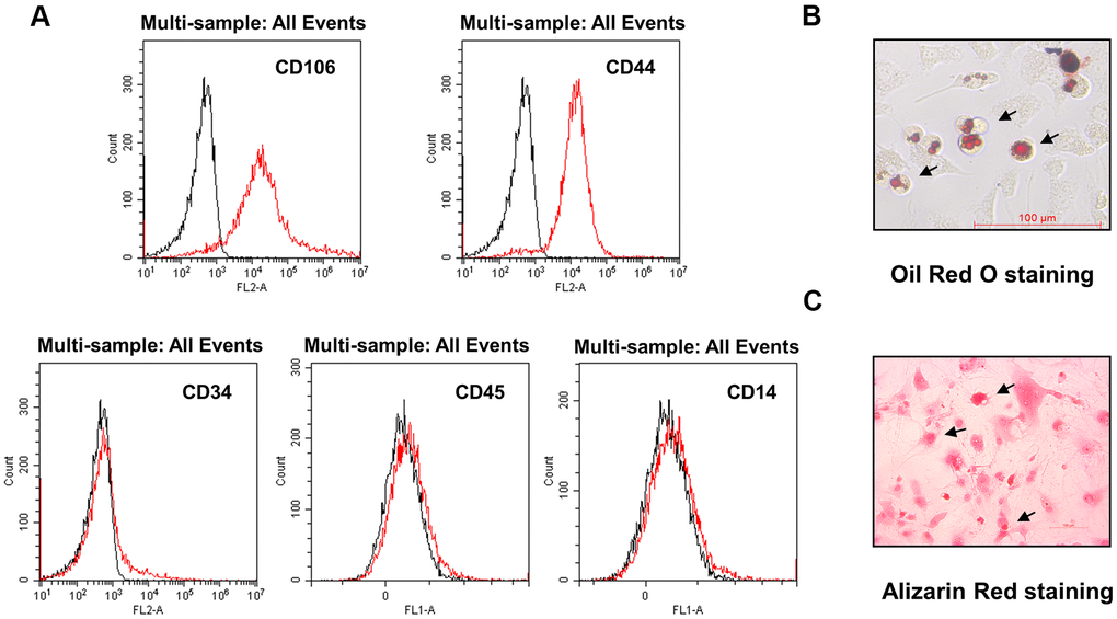Fluorescence-activated cell sorting (FACS) analysis of DMSCs at passage four revealed that most cells were negative for CD34, CD45, and CD14, but strongly expressed MSC-specific surface antigens such as CD44 and CD106 (Figure 1A). When cultured in differentiation medium, the isolated DMSCs could differentiate into adipocytes (Figure 1B) and osteoblasts (Figure 1C), as demonstrated through oil red O and alizarin red staining, respectively, indicating that DMSCs were successfully extracted.