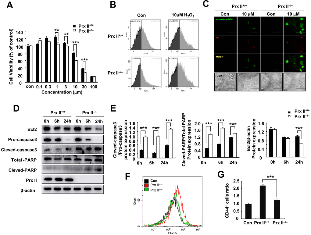 To explore the reasons for differences in wound healing, we first assessed the cell proliferation and differentiation potentials of Prx II+/+ DMSCs and Prx II−/− DMSCs. We observed no significant difference between either parameter in Prx II+/+ DMSCs and Prx II−/− DMSCs (Figure 3A–3C). The antioxidant potential of stem cells can affect the therapeutic potential of stem cells. Therefore, we used H2O2 to stimulate Prx II+/+ DMSCs and Prx II−/− DMSCs in vitro. Prx II−/− DMSCs showed lower viability than Prx II+/+ DMSCs, and flow cytometric analysis revealed that significantly more Prx II−/− DMSCs died after H2O2 treatment in vitro than Prx II+/+ DMSCs (Figure 4A, 4B). To determine the rate of DMSC apoptosis following H2O2 treatment, we obtained fluorescence microscopy images of cells stained with fluorescein isothiocyanate (FITC)-conjugated Annexin V and propidium iodide (PI) after H2O2 treatment, and analyzed the expression levels of apoptotic proteins via western blotting. Treatment with 10 μM H2O2 induced Annexin V expression, downregulated Bcl2 expression, and upregulated cleaved caspase 3, pro-caspase 3, cleaved PARP, and total PARP. In addition, compared with Prx II+/+ DMSCs, H2O2 induced significantly higher levels of apoptosis in Prx II−/− DMSCs (Figure 4C–4E). Furthermore, significantly less CD44-positive cells were observed at wound sites in the Prx II−/− DMSC-treated group compared with the Prx II+/+ DMSC-treated group, as determined by flow cytometry (Figure 4F, 4G). These results indicate that Prx II deletion weakened the anti-oxidative stress capacity of DMSCs and increased apoptosis in DMSCs, leading to fewer surviving stem cells at wound sites.