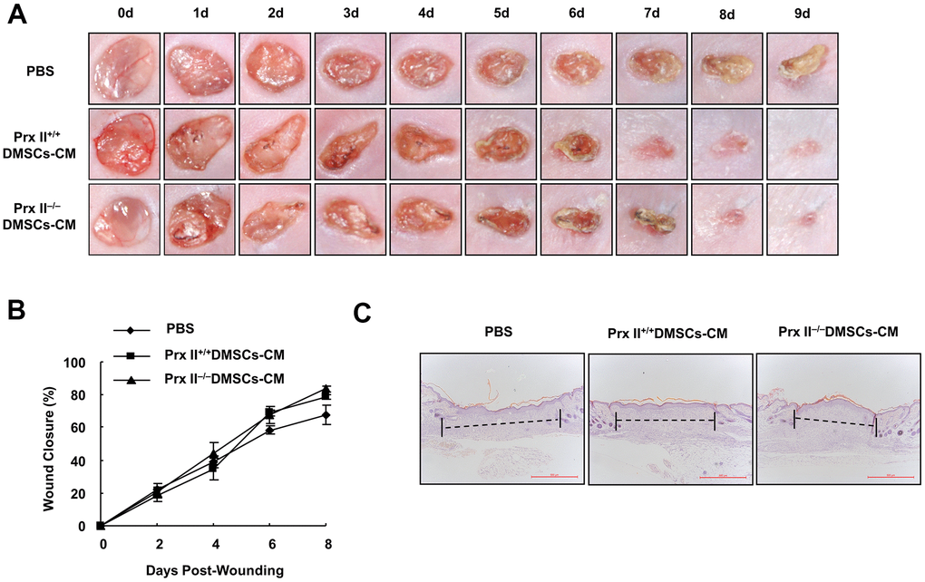 Deletion of Prx II did not influence the effect of DMSC-CM treatment on skin wound healing