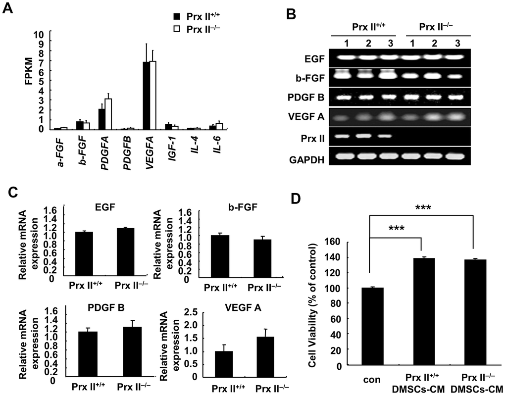 The conditioned culture medium of stem cells is rich in various growth factors that can promote wound healing [14]. Several reports have shown that the active components of MSC-CM include EGF, b-FGF, PDGF B, and VEGF A (among other factors) and that these cell-growth factors promote skin fibroblast proliferation and then enhance skin wound healing [15]. Therefore, we investigated whether Prx II can regulate cell-growth factor secretion by DMSCs. mRNA sequencing was performed to detect the mRNA levels of various cell-growth factors (Figure 6A), and reverse transcription-polymerase chain reaction (RT-PCR) analysis was performed to detect the mRNA levels of EGF, b-FGF, PDGF-B, and VEGF-A (which had pro-proliferative effects on fibroblasts) in Prx II+/+ and Prx II−/− DMSC-CM. Statistical analysis revealed no significant differences in growth factors in Prx II+/+ DMSCs and Prx II−/− DMSCs (Figure 6B, 6C). To confirm the effect of DMSC-CM-induced proliferation in fibroblasts, we measured the proliferation of primary dermal fibroblasts treated with Prx II+/+ DMSC-CM or Prx II−/− DMSC-CM. DMSC-CM significantly promoted dermal fibroblast proliferation, but no difference was observed in the promotion effects between Prx II+/+ DMSC-CM and Prx II−/− DMSC-CM (Figure 6D). These findings are consistent with the results of our in vivo experiments on DMSC-CM treatment. Our results suggest that Prx II does not regulate cell-growth factor secretion by DMSCs, leading to the same pro-proliferation effect on dermal fibroblasts during the skin wound-healing process. Therefore, no significant difference was observed between Prx II+/+ DMSC-CM and Prx II−/− DMSC-CM during the treatment of skin wounds.