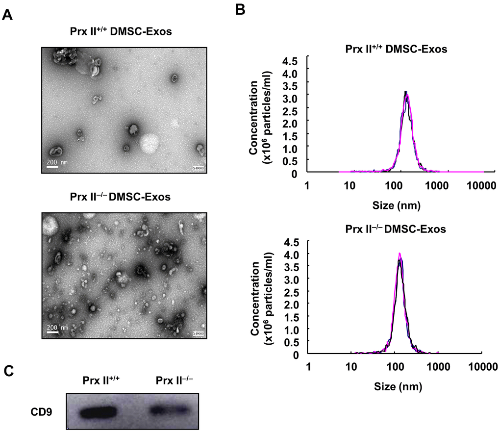 Exosomes are vesicles with diameters ranging from 40 nm to 200 nm that can be released into the extracellular environment [16]. Data from numerous animal studies have shown that MSC exosomes regulate inflammation, cell proliferation, migration, angiogenesis, and matrix reconstruction in wound healing [17, 18]. To verify the role of Prx II in the treatment of skin wound healing using exosomes derived from DMSCs, Prx II+/+ DMSC-Exos and Prx II−/− DMSC-Exos were extracted, and their ultrastructures and particle-size distributions were analyzed through transmission electron microscopy and nanoparticle-tracking analysis. The vesicles had a characteristic cup-shaped morphology (Figure 7A) and the size distribution of most exosomes in both groups ranged from 40 nm to 200 nm (Figure 7B). Western blotting was performed to analyze expression of the exosomal surface marker, CD9 (Figure 7C).