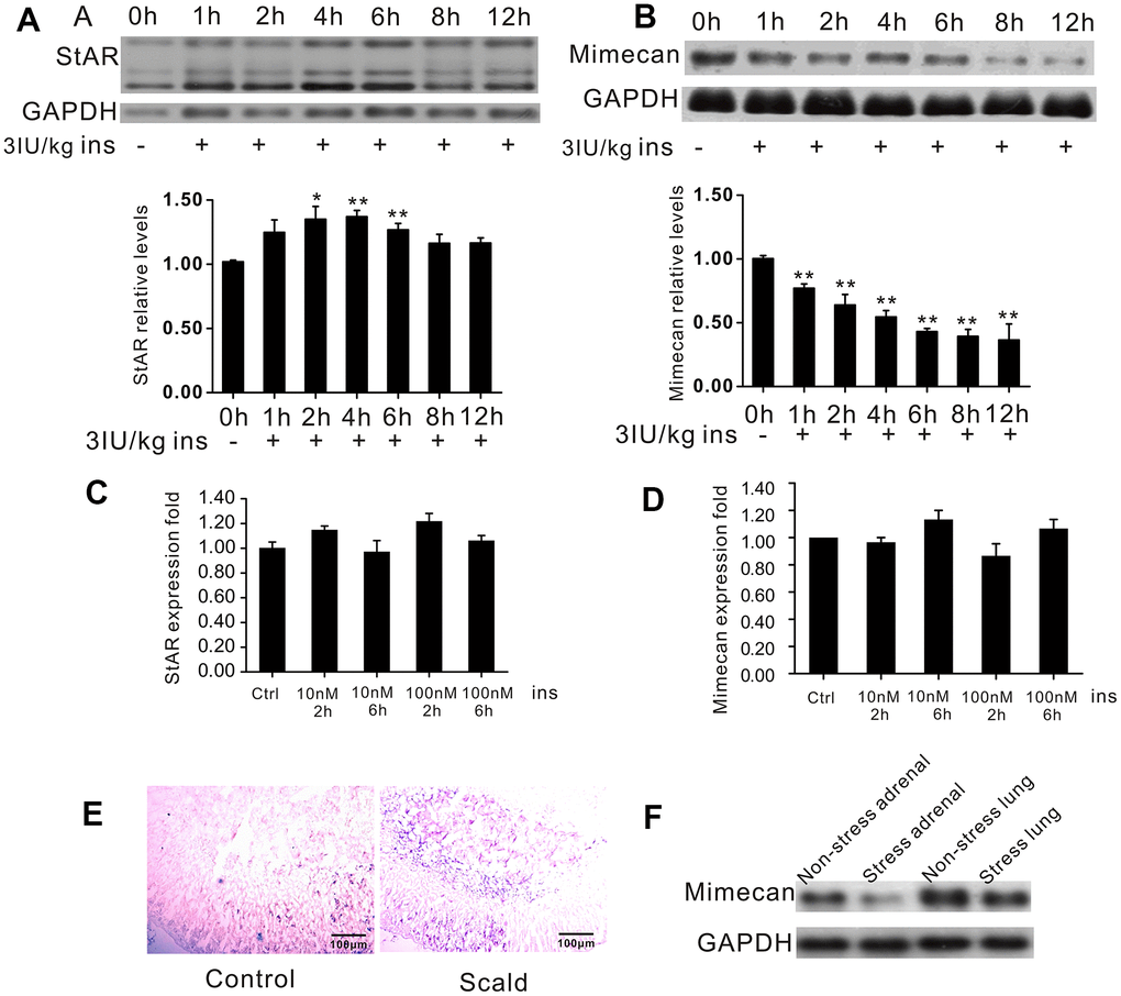 Hypoglycemia is a physiological stressor that leads to activation of the HPA axis [13]. We established insulin-induced hypoglycemia in mice, a commonly used acute physical stress model, to investigate the expression of mimecan after acute stress [14–18]. The test mice were fasted for 12 h overnight and then given insulin (3 IU/kg body weight) by IP injection. Blood glucose was subsequently measured at various time points. Blood glucose levels were all below 2.2 mmol/L, showing a successfully induced hypoglycemia state in the stressed group (Table 1). As anticipated, the expression of StAR, which is a marker of stress, was induced by hypoglycemic stress, showing significant upregulation at 1 h after insulin dosing and peaking at 6 h (Figure 2A). Interestingly, significant time-dependent downregulation of mimecan expression was observed (Figure 2B). However, blood glucose normalized 8 h after insulin administration (Table 1), implying that reduced mimecan expression is not induced by hypoglycemia state. To exclude the possibility that StAR up-regulation and mimecan down-regulation are induced by insulin itself, rather than by insulin-induced hypoglycemia stress, we examined the StAR and mimecan mRNA levels after insulin stimulation in Y1 cells (Figure 2C, 2D). No significant changes in StAR or mimecan mRNA levels were observed at 2 and 6 h after insulin stimulation. To further verify this result, we established another acute stress model, burn trauma in mice, as described [19]. In situ hybridization showed that the expression level of StAR mRNA significantly increased in the adrenal tissues of mice after scalding (Figure 2E), so this stress model appears to be sound. Northern blot analysis showed a significant downregulation of mimecan in adrenal tissue, whereas levels in mouse lung tissues were unchanged after scalding (Figure 2F). The above results reveal that mimecan expression in adrenal tissue is significantly decreased after exposure to acute stress.