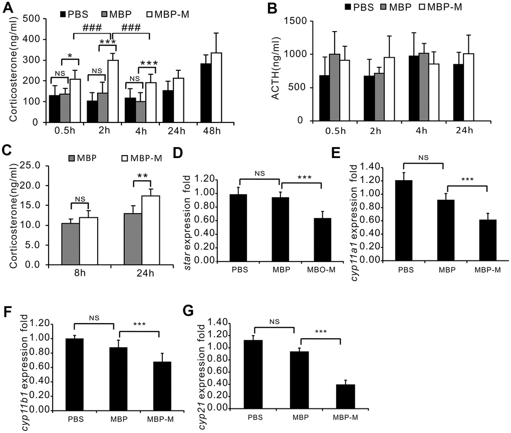 Having shown that mimecan is downregulated by ACTH and that corticosterone increases mimecan expression in adrenal tissues, we further investigated whether mimecan regulates ACTH and corticosterone secretion. C57BL/6 mice received IP injections of mimecan-MBP fusion protein, PBS, or MBP alone at doses of 0.1 μmol/kg body weight. Whole blood was then obtained from retro-orbital spaces for ACTH and corticosterone assay (ELISA). There were no significant differences in the serum corticosterone concentrations between the PBS and MBP injected groups; thus, we just compared the MBP-mimecan and MBP injecting groups. Serum corticosterone concentrations were much higher in C57BL/6 mice that received the mimecan-MBP fusion protein at the stated dose than in recipients of MBP (Figure 5A) and these elevated significantly at 0.5 h after IP injection of mimecan-MBP fusion protein, reaching a peak at 2 h, maintaining high levels for at least 4 h and then normalizing at 24 h (Figure 5A). Serum levels of ACTH did not differ significantly among any of these treatment groups (Figure 5B). These data suggest that mimecan-induced corticosterone secretion is not mediated by heightened levels of ACTH. Compared with MBP-treated Y1 cells, the concentration of corticosterone in culture media clearly increased after treatment with mimecan-MBP fusion protein for 24 h, as opposed to after 8 h at a dose of 7.64 μM (Figure 5C). To determine the mechanism responsible for corticosterone elevation, the expression levels of key genes regulating corticosterone synthesis in adrenal tissues, such as StAR, CYP11A1, CYP11B1 and CYP21, were detected using real-time PCR. Remarkably, the expression levels of these genes in the adrenal tissues of mice were substantially downregulated at 4 h after IP injection of mimecan-MBP fusion protein (Figure 5D–5G). Therefore, the observed mimecan-induced rise in the corticosterone concentration in mouse serum or Y1-cell culture media was probably due to intensified corticosterone secretion by stimulated adrenal cortical cells rather than increased corticosterone synthesis.