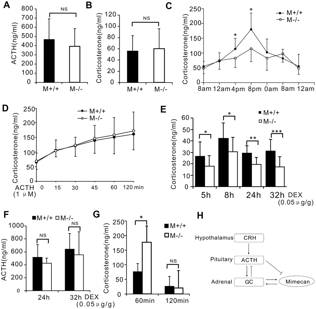 The dosage and administration method used were based on previous studies [37, 38]. C57BL/6 mice were randomly assigned to each group (10 mice per group for each time point). Dexamethasone (D4902, Sigma-Aldrich, St. Louis, MO, USA) (0.05 ug/g body weight) or 0.9% saline was administered by intramuscular (IM) injection to experimental and control groups, respectively, and mice were sacrificed by cervical dislocation at the indicated time points: 2, 12, and 36 h at 7:30 p.m. (when cortisol secretion peaks). Adrenal glands were immediately taken and frozen at –80° C. In mim-/- mice and wild-type litter mates (21 mim-/- and 15 WT), the same dose of DEX was given by IM injection. Blood samples used for corticosterone and ACTH measurement were removed from the tail vein at 5, 8, 24, and 32 h after DEX administration at 12 a.m.