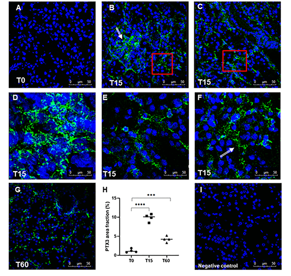 The characterization and localization of PTX3 signal were investigated on frozen tissue included in OCT medium (Tissuetek). The slides were incubated with 5% rabbit serum for 1 hour at 37° C. Slides were then incubated for 1 hour at room temperature with specific antibodies. After three washes in PBS, slides were then incubated with the appropriate secondary antibodies(Alexa Flour 488 and 555, Molecular Probes, Eugene, OR). All sections were counterstained with TO-PRO-3 (Molecular Probes). Negative controls were prepared with irrelevant antibodies. The sections were analyzed using the Leica TCS SP2 (Leica, Wetzlar, Germany) confocal laser-scanning microscope. The number of infiltrating cells was measured in at least10 high power (x630) fields/section by two independent observers blinded to the origin of the slides. The final counts were the mean of the two measures. In no case interobserver variability was higher than 20%.
