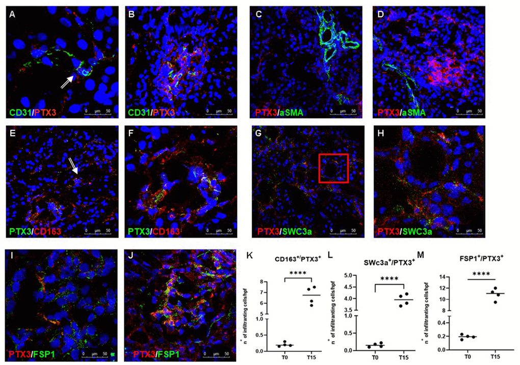 It is well known that I/R injury is characterized by increased activation of innate and adaptive immune responses, including inflammatory cell trafficking into the diseased organ that further exacerbates injury via immune cells and Complement system [25]. In our swine model, we also observed, already 15 min after reperfusion, a dense inflammatory infiltrate composed largely of macrophages and dendritic cells in the tubule-interstitial area. We found that both these antigen-presenting cells were characterized by increased PTX3 expression when compared to T0, since we observed an increased number of CD163+/PTX3+ (Figure 2E, 2F, 2K) and SWC3a+/PTX3+ (Figure 2G, 2H, 2L) cells at tubule interstitial levels at T15.