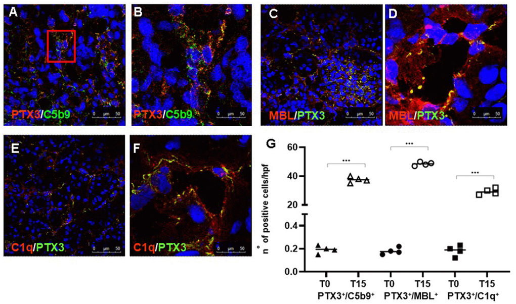 Although Complement activation in I/R in rodents is mainly localized at tubular level [44], during the reperfusion phase, the endothelium is the primary target of different pro-inflammatory agents, including Complement mediators [2]. We previously demonstrated that in swine model of I/R injury as well as in DGF patients, the activation of the Complement system occurs in the early phase, on peritubular capillaries, within the interstitium, and on the glomerular endothelium [23]. Our data showed a clear co-localization of C5b-9 deposits on PTX3+EC after 15 min following reperfusion (Figure 3A, 3B). Therefore, renal endothelium seems to be the prevalent site of PTX3-mediated Complement activation in the early phase of I/R injury in both preclinical and clinical settings.