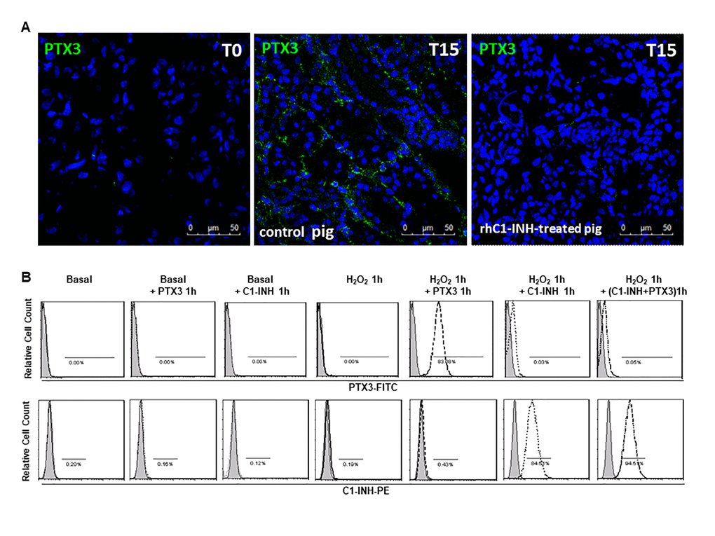 Moreover, to support the hypothesis that the reduction of PTX3 deposits in rhC1-INH treated animals was associated with the inhibition of endothelial damage, we performed in vitro experiments and we evaluated rhC1-INH and PTX3 binding on cultured EC under normal conditions or in the presence of cellular stress (Figure 4B). FACS analysis showed that EC in normal condition did not bind both rhC1-INH and PTX3. In accordance with our previous study [26] we observed an increased cellular binding of rhC1-INH on H2O2-stimulated EC compared to basal condition. Moreover, in the absence of rhC1-INH, PTX3 could bind activated EC. Interestingly, when H2O2-activated EC were incubated with PTX3 and rhC1-INH, we observed that C1INH was able to protect EC upon blocking PTX3 binding.