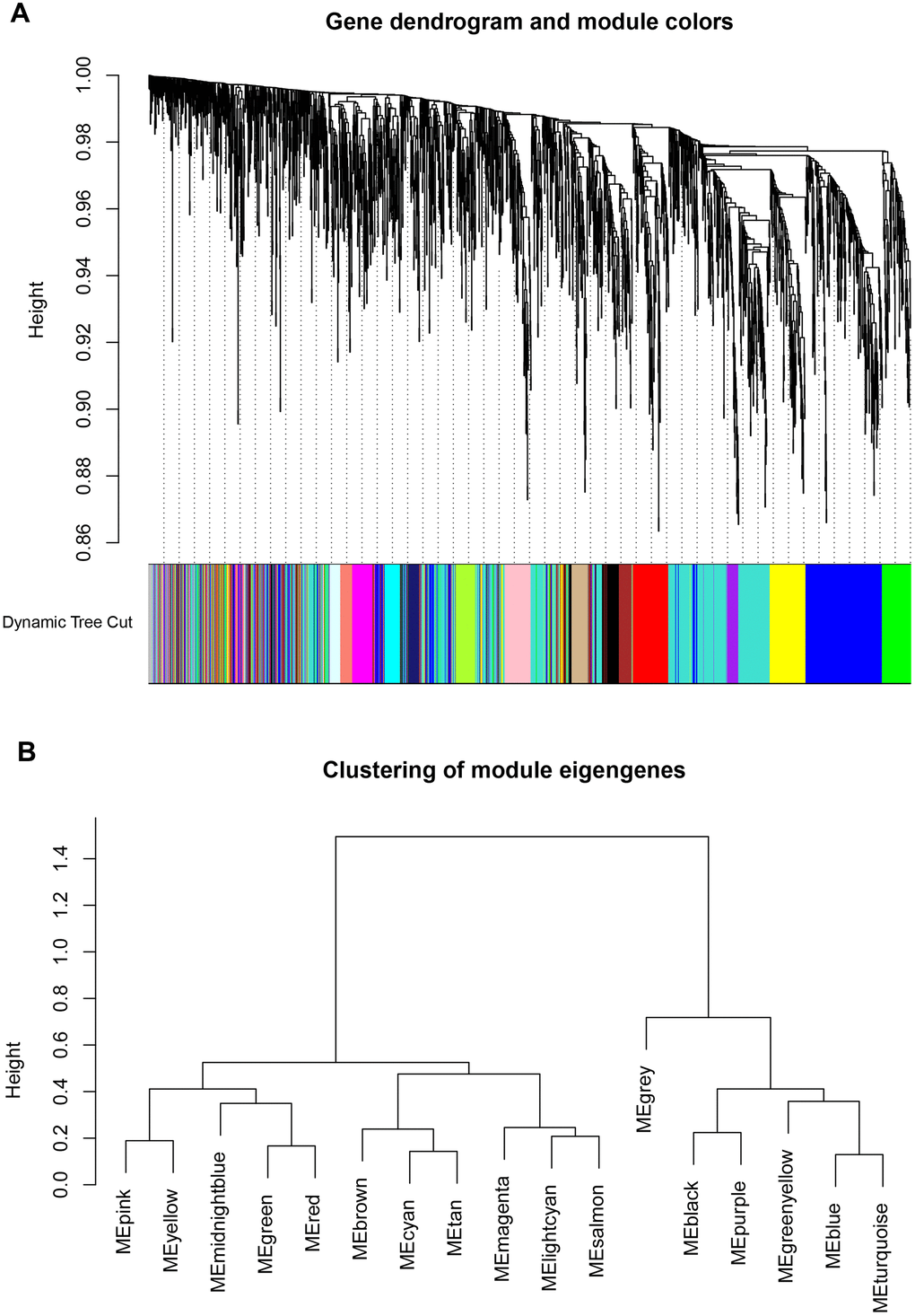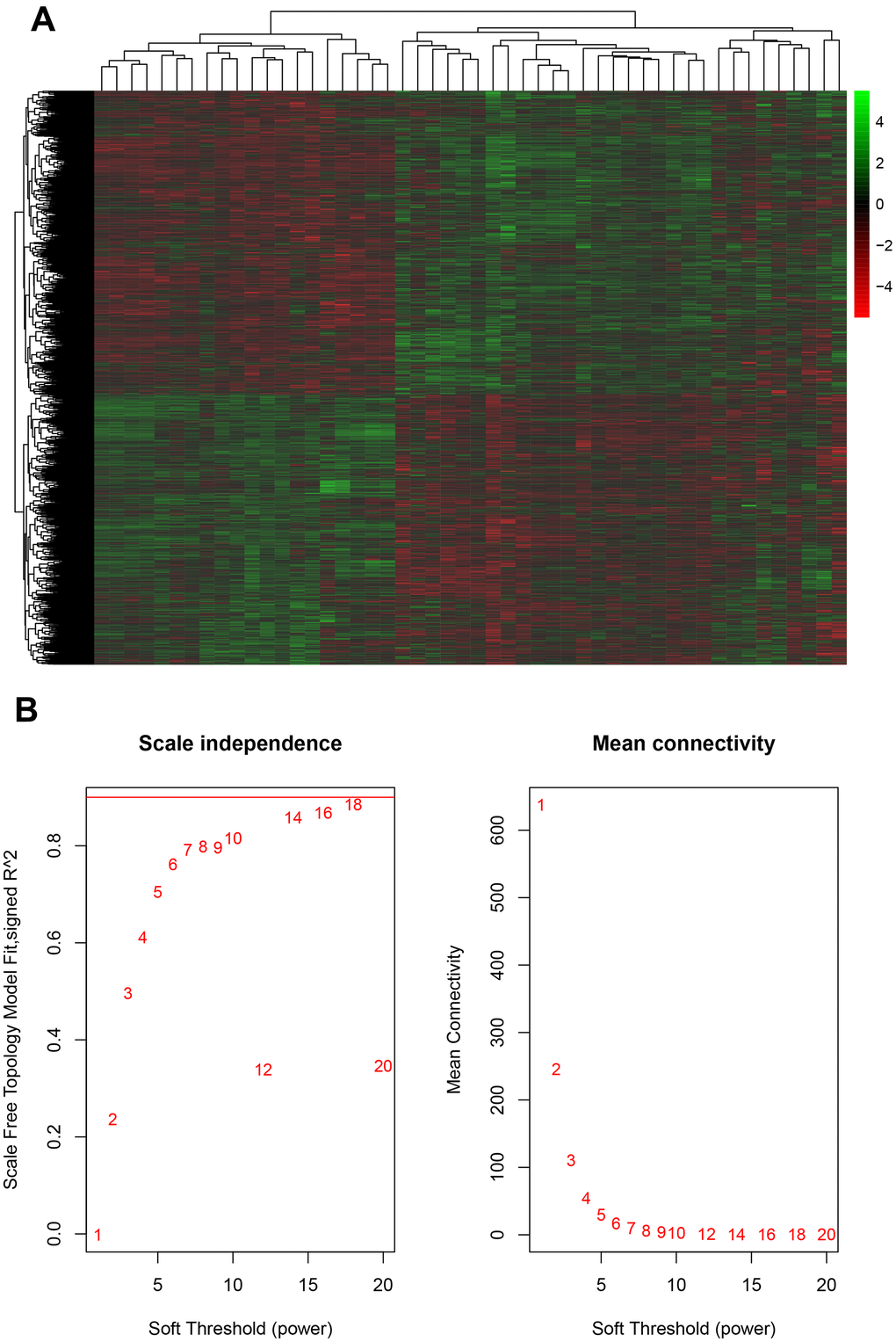 The WGCNA analysis was constructed using R software. The results of the parameter analysis are shown in Figure 2A. After determining the optimal parameter (β=4), the WGCNA algorithm was used to convert the correlation coefficient of a gene pair into the adjacent coefficient. We finally obtained 3 gene modules (Figure 3). A total of 590 genes were included in Module 1, 366 genes were included in Module 2, and 189 genes were included in Module 3.