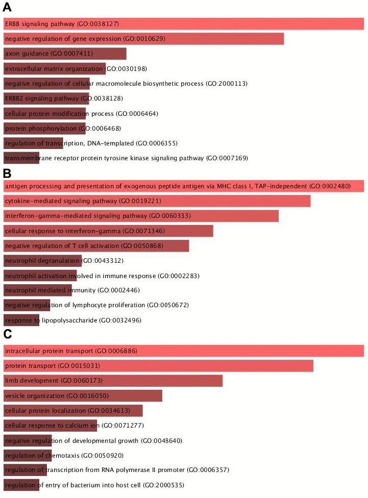 Then, we applied bioinformatics analysis of key targeting modules of circITGA7 in glioma using DAVID system. Module 1 was involved in regulating ERBB signaling, negative regulation of cellular macromolecule biosynthetic process, ERBB2 signaling, cellular protein modification process, and protein phosphorylation. Module 2 was related to antigen processing and presentation of exogenous peptide antigen via MHC class I, cytokine-mediated signaling, interferon-gamma-mediated signaling, cellular response to interferon-gamma, neutrophil degranulation, neutrophil activation involved in immune response, neutrophil mediated immunity, negative regulation of lymphocyte proliferation. And Module 3 was involved in regulating intracellular protein transport, protein transport, limb development, vesicle organization, cellular protein localization, regulation of chemotaxis, regulation of transcription from RNA polymerase II promoter (Figure 4).