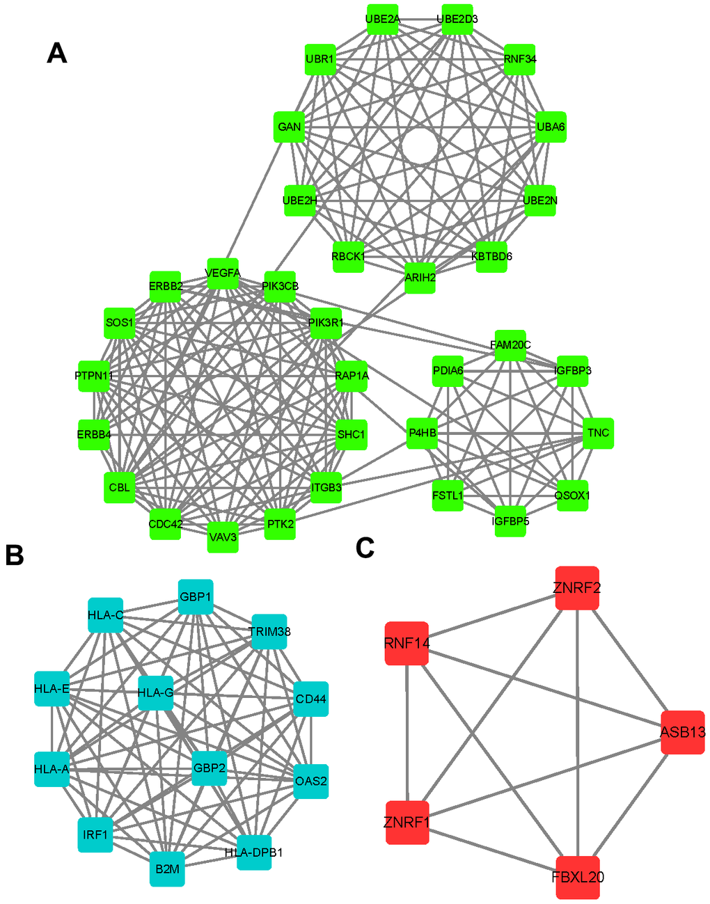 Then, we applied PPI network analysis to identify key targets of circITGA7 in glioma using String database. As shown in Figure 5, a total of 33 key targets in module 1 were identified, including SHC1, PTK2, CBL, ERBB4, VAV3, CDC42, RNF34, GAN, UBE2D3, UBR1, UBE2A, UBA6, KBTBD6, UBE2H, RBCK1, ARIH2, ERBB2, RAP1A, PIK3CB, PIK3R1, VEGFA, SOS1, PTPN11, P4HB, PDIA6, FAM20C, TNC, IGFBP3, IGFBP5, FSTL1, ITGB3, UBE2N, QSOX1. 12 key targets in module 2 were identified, including HLA-DPB1, HLA-A, B2M, GBP2, IRF1, TRIM38, HLA-G, OAS2, HLA-E, CD44, HLA-C, and GBP1. 5 key targets in module 3 were identified ZNRF2, ZNRF1, RNF14, ASB13, FBXL20.
