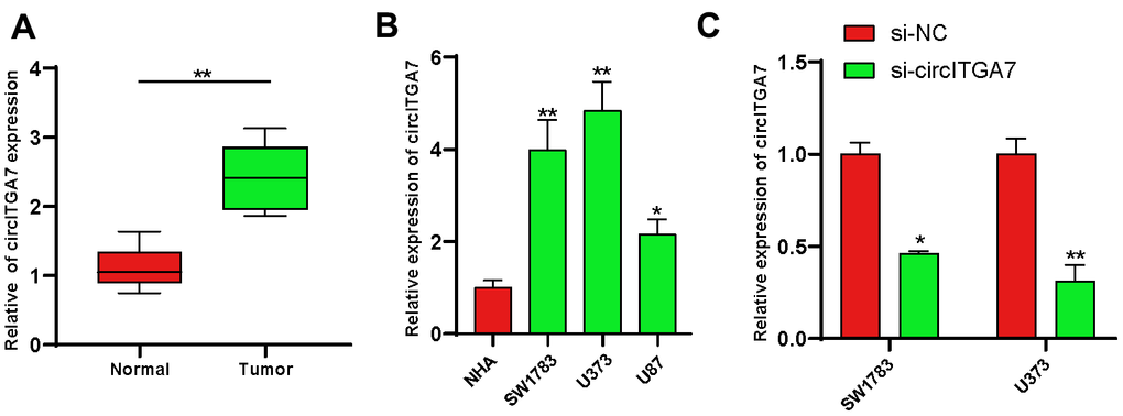 We firstly evaluated the expression of circITGA7 levels in glioma tissues. For that purpose, 12 pairs of glioma tissues and adjacent normal tissues were subjected to analysis. Our data revealed circITGA7 level was raised in glioma tissues (Figure 6A).