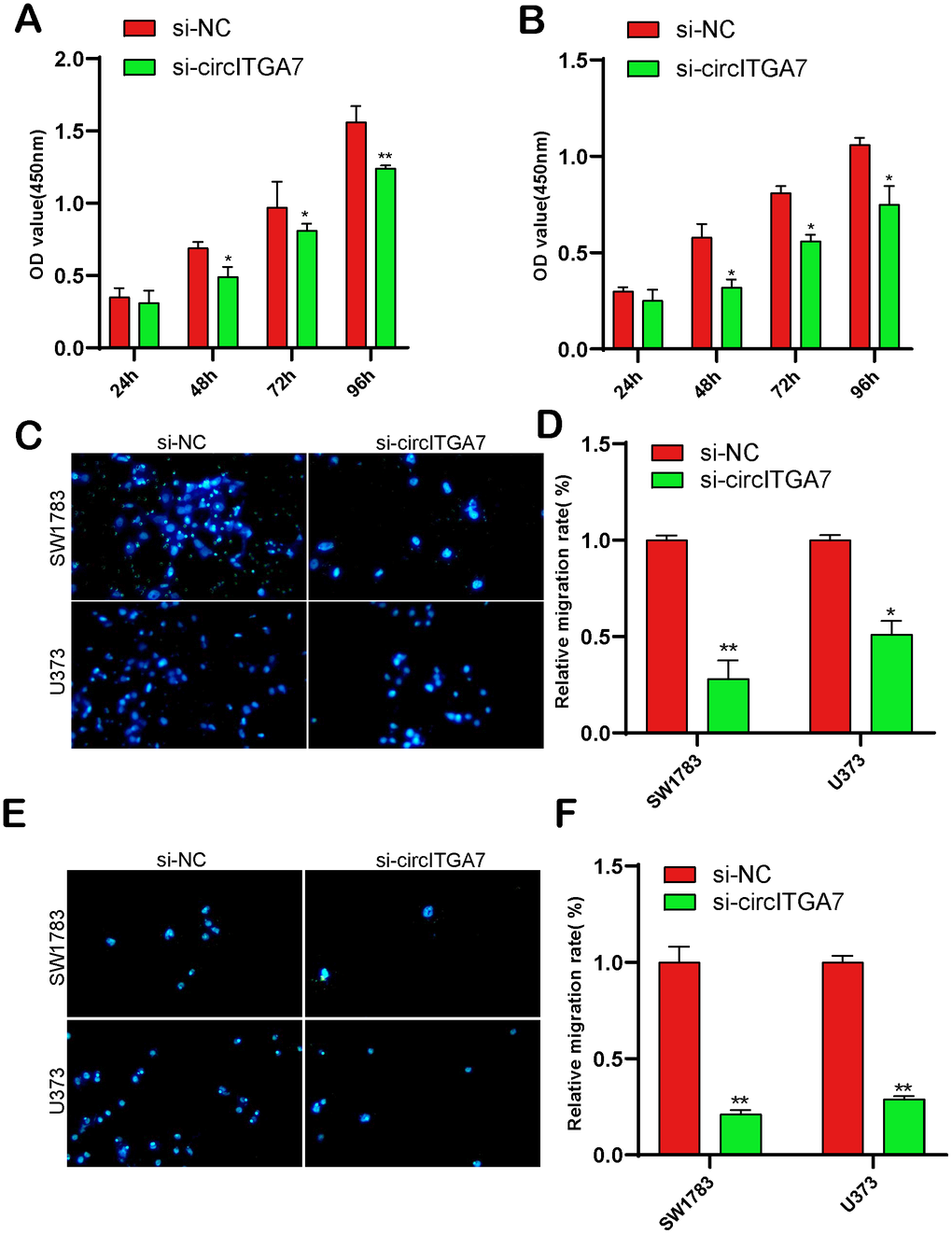Here, we determined circITGA7 expression in glioma cell lines to explore the circITGA7-mediated influence on glioma. Our data revealed circITGA7 level was higher in glioma cells compared to that in NHA cells. Of them, SW1783&U373 cells highly expressed circITGA7 (Figure 6B) and were used for the following studies. Figure 6C demonstrated circITGA7 expression levels after knockdown of circITGA7 in SW1783&U373 cell lines. CCK-8 assay shown knockdown circITGA7 marred SW1783&U373 cell proliferation (Figure 7A, 7B). Further data revealed the circITGA7 level was negatively related to metastasis. Transwell demonstrated down-regulation of circITGA7 restrained SW1783&U373 cell migration and invasion (Figure 7C–7F).