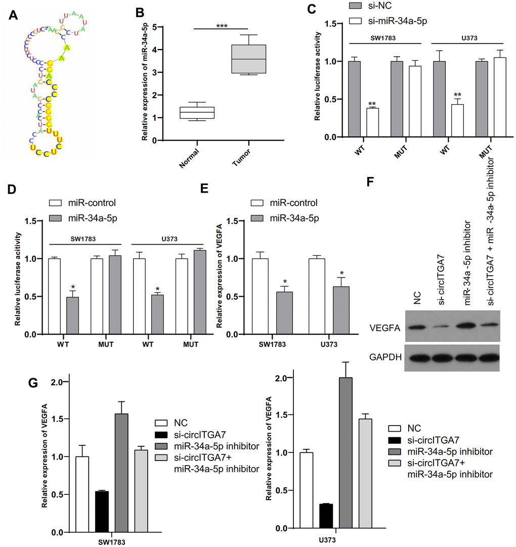 Emerging data suggested miRNAs functioned through interaction with 3ʹ-UTR of target mRNAs [16]. Therefore, we unearthed targets of miR-34a-5p by the TargetScan and miRanda databases. We selected VEGFA for the study. Luciferase assay indicated miR-34a-5p mimics impeded the activity of WT-VEGFA reporter (Figure 8D). What is more, overexpressed miR-34a-5p obviously inhibited VEGFA level in SW1783&U373 cells (Figure 8E). Furthermore, western blot results showed that VEGFA protein level was decreased in cells transfected with si-circITGA7, and increased in cells transfected with miR-34a-5p inhibitor, and that miR-34a-5p inhibitor attenuated the VEGFA protein level decrease by si-circITGA7 compared with the control group (Figure 8F). Considering our data have displayed miR-34a-5p level could be suppressed by circITGA7, and VEGFA was a target of miR-34a-5p, we further investigated the underlying mechanism in circITGA7-regulated VEGFA expression. Collectively, our data indicated that VEGFA level was increased by circITGA7 via sponging miR-34a-5p (Figure 8G).