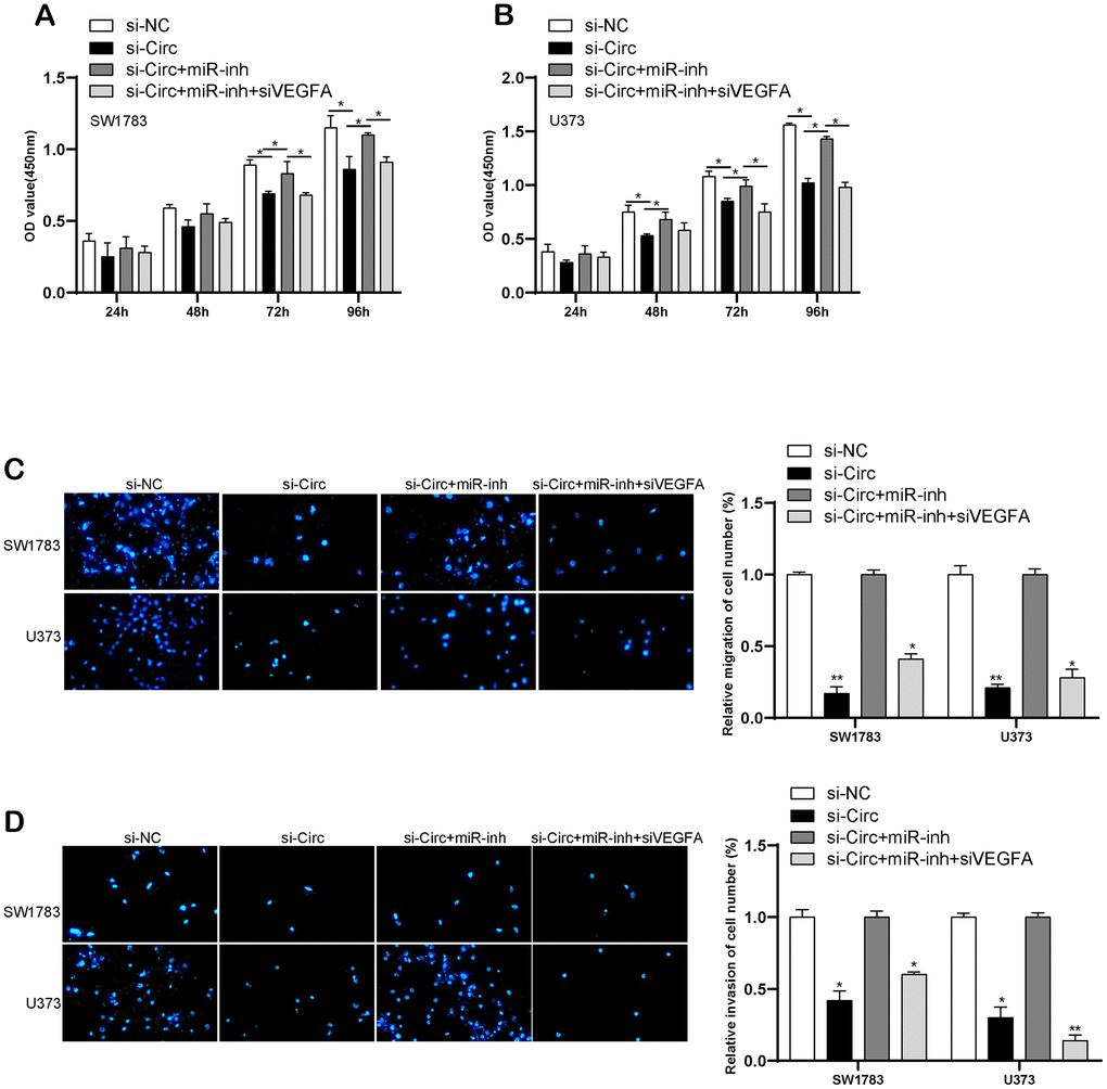 We performed the rescue assay to validate circITGA7-induced altered effects on SW1783&U373 cell metastasis after knockdown of miR-34a-5p or VEGFA. CCK-8 and transwell assays revealed downregulated circITGA7 inhibited SW1783&U373 cell growth and metastasis. Nevertheless, suppressed miR-34a-5p induced glioma cell growth, migration and invasion, whereas those effects could be reversed once down-regulation of VEGFA in glioma cells (Figure 9A–9D). Our findings have shown circITGA7 and VEGFA functioned as a promoter in glioma, while miR-34a-5p was regarded as an inhibitor of oncogene. Furthermore, circITGA7 functioned through regulating miR-34a-5p/VEGFA signaling.
