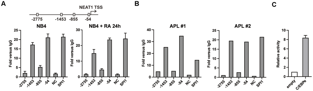 Previously, we found that C/EBP family member C/EBPβ directly bound to and transactivated NEAT1 promoter via C/EBP binding sites [15]. However, overexpression of C/EBPβ only resulted in slight activation of NEAT1. Based on the crucial role of C/EBPα in granulopoiesis [17], we hypothesize that it contributes to the regulation of NEAT1 in a similar pattern to C/EBPβ. As shown in Figure 1A, the chromatin immunoprecipitation (ChIP)-qPCR results showed that the regions around -1453 bp and -54 bp sites were obviously precipitated with anti-C/EBPα antibody in both untreated and ATRA-treated NB4 cells. The findings were validated on samples isolated from APL patients (Figure 1B). Then in the luciferase reporter assays with 293T cells which do not express endogenous C/EBPα, 1656 bp NEAT1 promoter construct encompassing the -1453 bp and -54 bp sites was activated by C/EBPα (Figure 1C). The above findings suggest that C/EBPα can bind to and transactivate the promoter of NEAT1 directly.