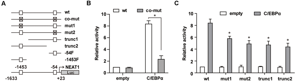 We further used a series of mutated and truncated NEAT1 promoter reporters constructed previously [15] (Figure 2A) to test the importance of -1453 and -54 sites in C/EBPα-mediated transactivation. As shown in Figure 2B, the luciferase assay results showed that double mutation of -1453 and -54 sites (co-mut) significantly impaired C/EBPα-mediated transactivation. Then we used the -1453 or -54 C/EBP site single mutated construct and 5’ or 3’ truncation of the NEAT1 promoter to perform the luciferase assay. The promoter activity of either site (-1453 or -54) mutated or truncated constructs was markedly attenuated (Figure 2C), indicating that C/EBPα transactivates the NEAT1 promoter through both -1453 and -54 sites.